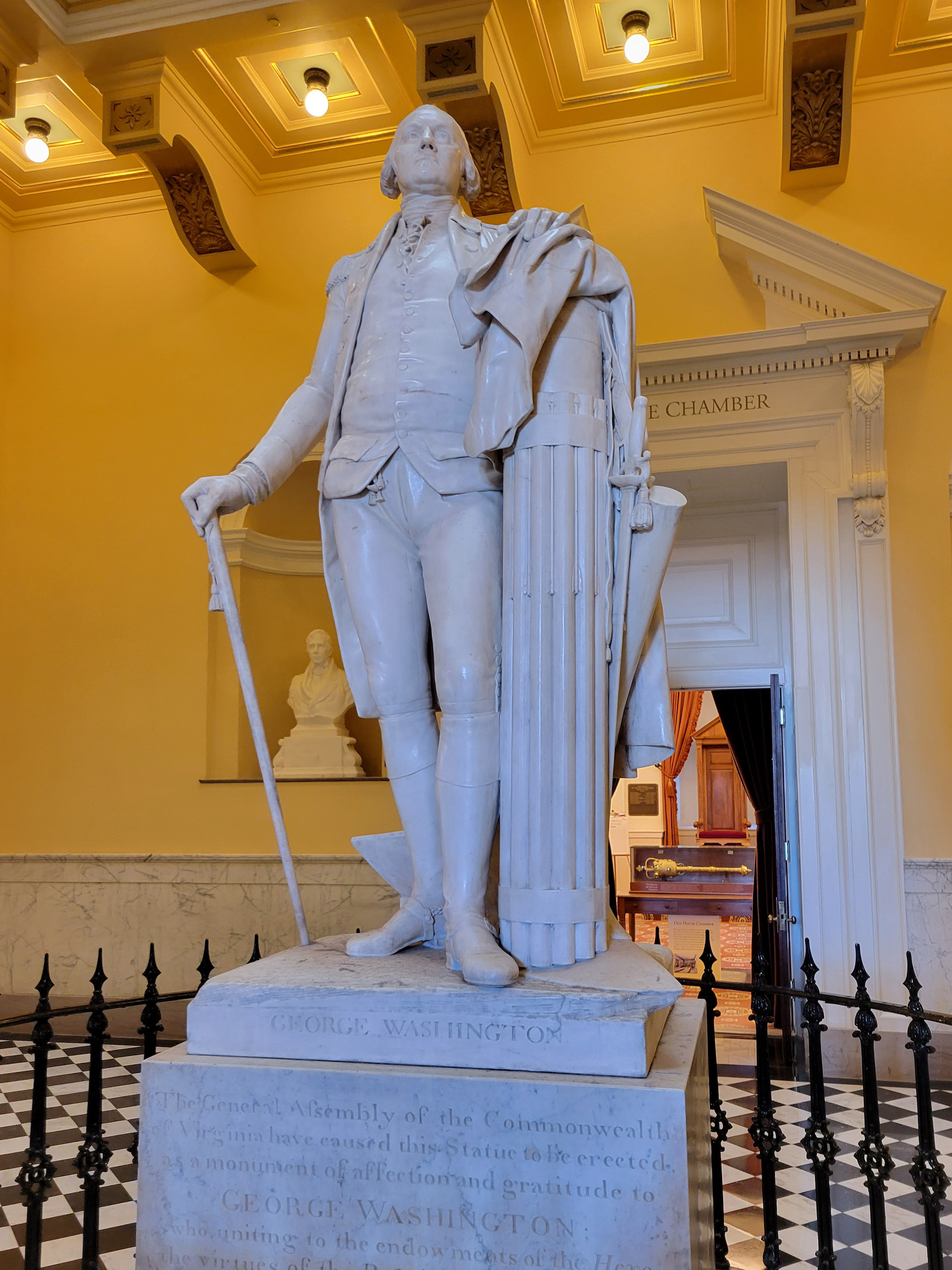 홀 중앙에 세워진 조지 워싱턴의 대리석 조각은 당대 최고의 조각가였던 프랑스인 장-앙투안 우동(Jean-Antoine Houdon)이 직접 미국을 방문해서 워싱턴을 만나고 돌아가 제작한 원본으로, 그를 가장 정확히 묘사한 조각으로 인정을 받는다. 그래서 지금까지 이 조각으로 본을 뜬 틀을 이용한 청동상과 석고상이 공식적으로만 30개 이상 제작되어서, 미국 전역은 물론 영국 런던과 페루 리마에서도 볼 수 있다는데, 워싱턴DC의 국회의사당 로툰다와 워싱턴 기념탑 내부에서 봤던 청동상이 모두 이 대리석상의 복제품이다.