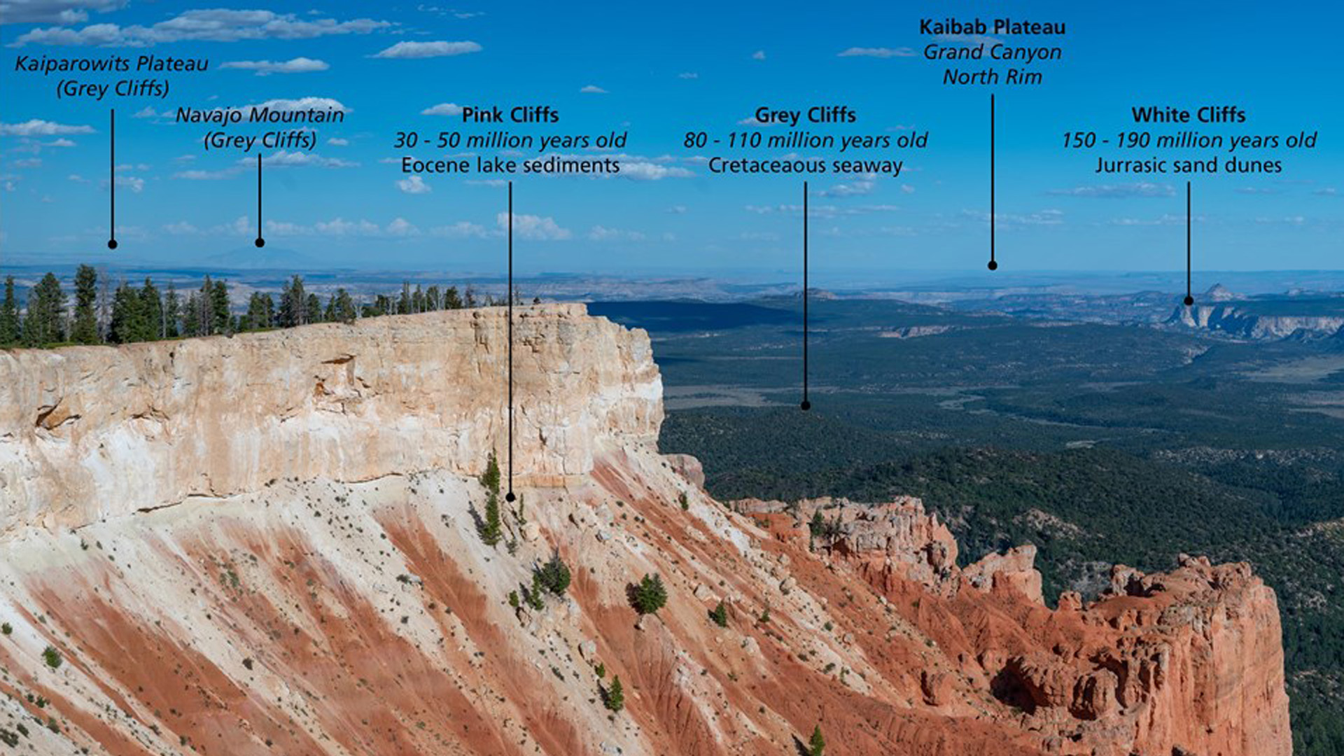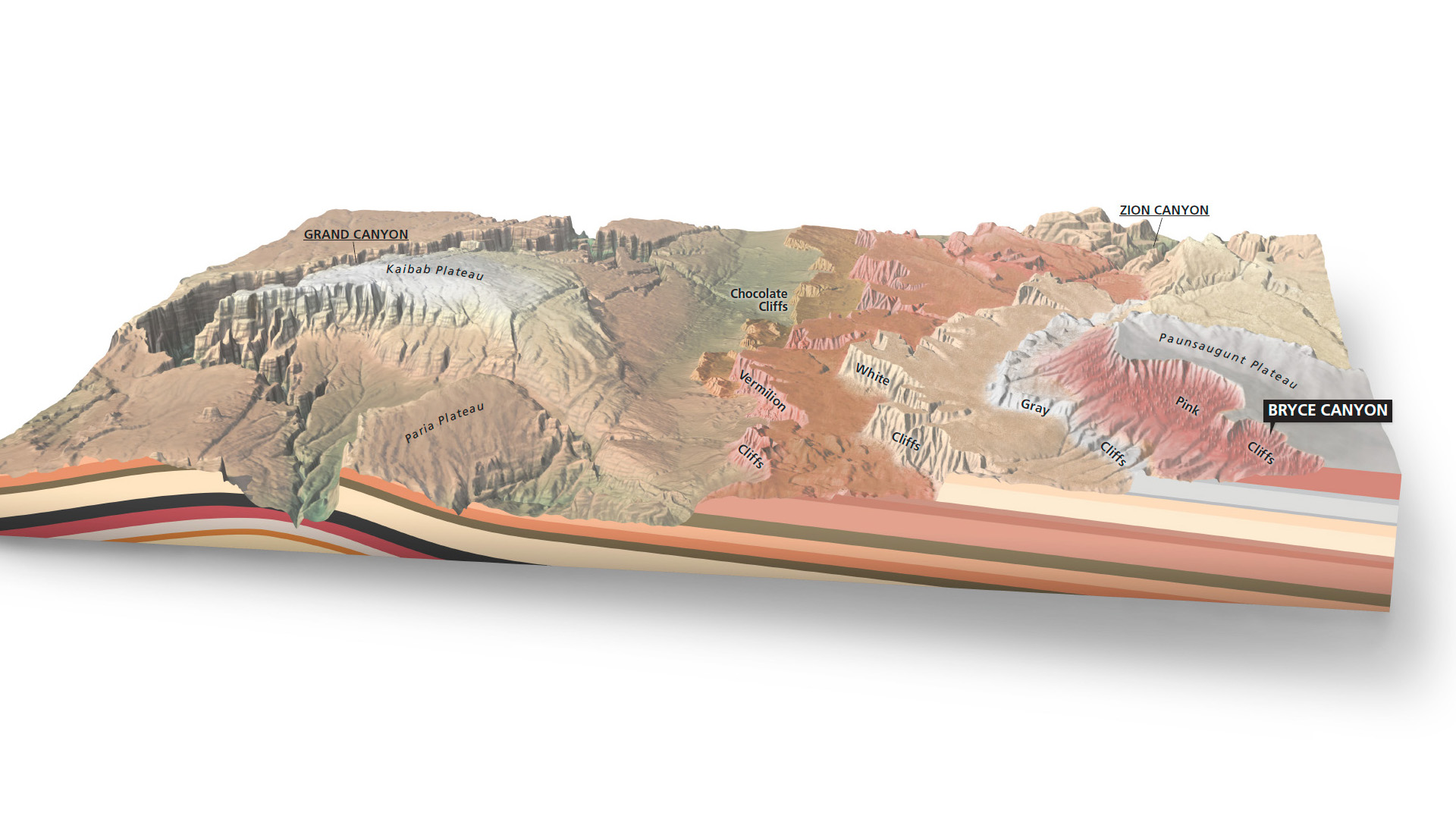 특히 이 '거대한 계단' 그랜드스테어케이스(Grand Staircase)의 모형도도 국립공원청에서 새로 잘 만든 것이 있어서, 그랜드캐년 바닥에서부터 브라이스캐년 꼭대기까지 차곡차곡 쌓여졌다는 것을 보여드립니다.