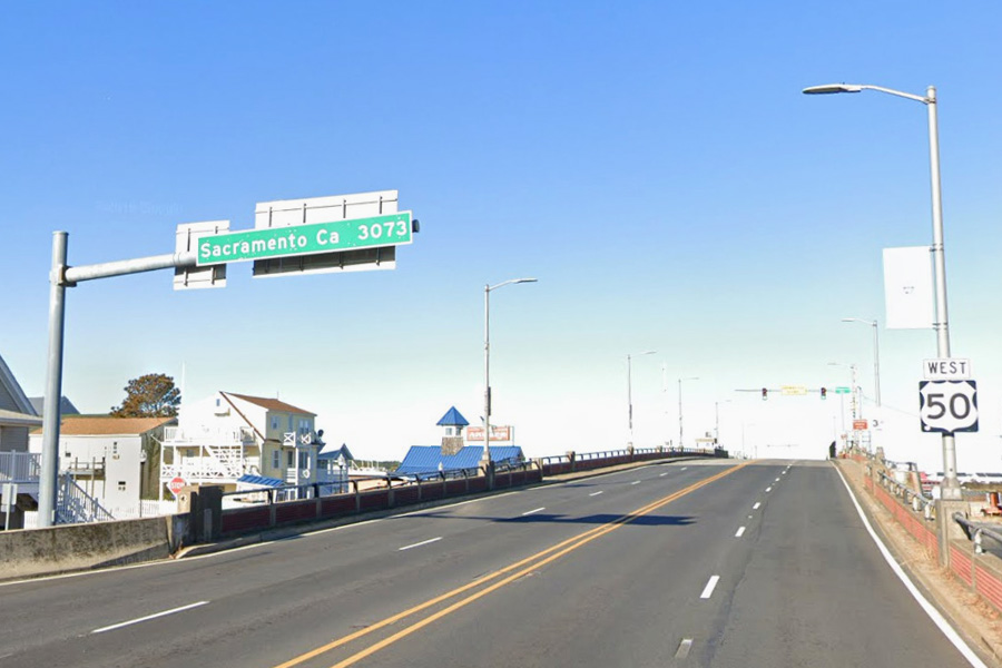 오션시티가 있는 펜윅 섬(Fenwick Island)을 떠나는 다리가 시작되는 곳 왼편에 Sacramento Ca 3073 도로표지판이 보인다. 즉, 여기가 동쪽 끝인 미국 50번 국도(U.S. Route 50)를 따라 3,073마일을 서쪽으로 달리면, 블로그에 두 편으로 소개했었던 네바다 주의 '미국에서 가장 외로운 도로'를 지나서, 옛날 살던 캘리포니아의 주도인 새크라멘토(Sacramento)에 도착한다는 뜻이다!