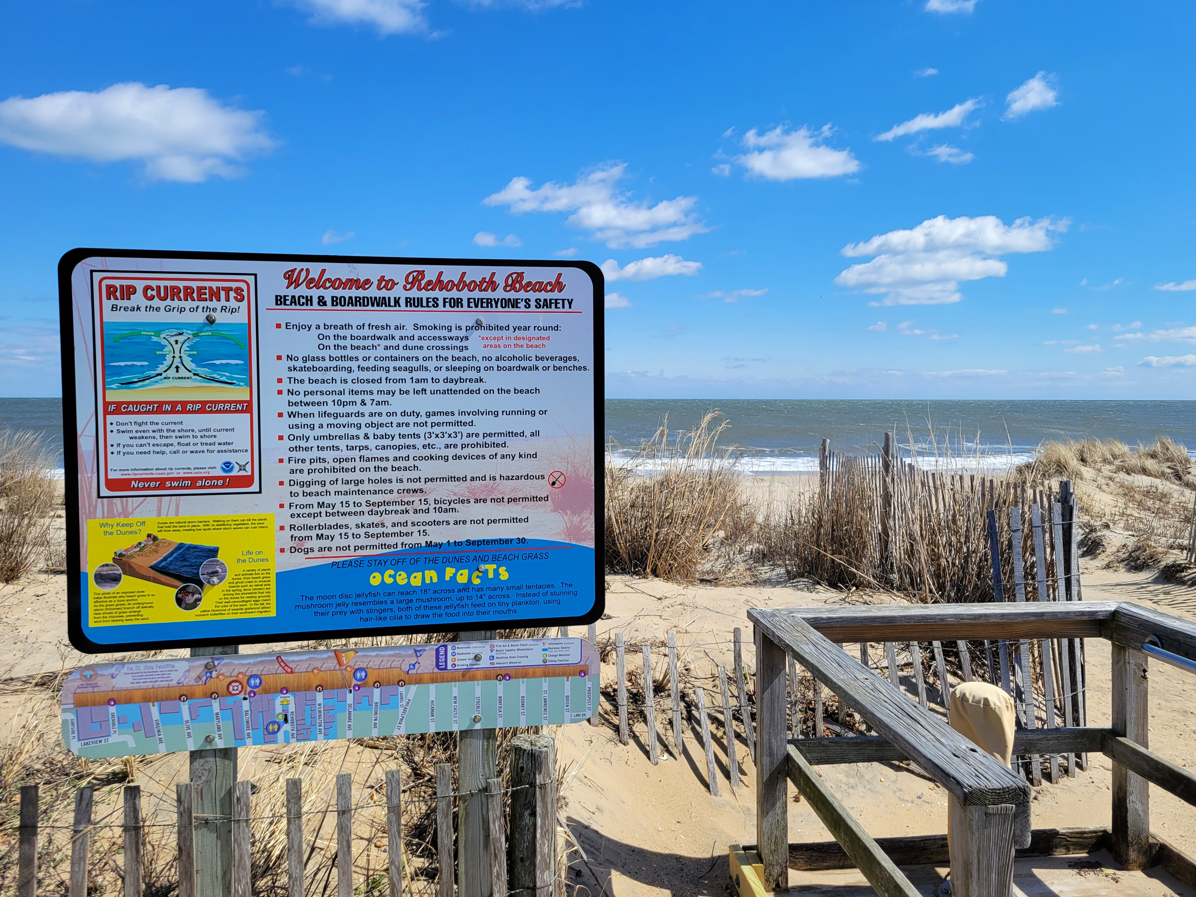 보드워크에서 내려가 풀들이 자라고 있는 작은 모래언덕(dunes)을 넘어가야만 평평한 모래사장이 나오는 것도 특이했는데, 이렇게 해야 바닷물 침수 피해도 막을 수 있고 모래도 유실되지 않고 보존된다는 설명이 노란 사각형 안에 적혀있다.