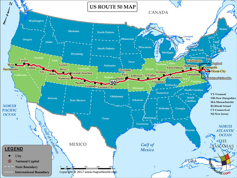 50번 국도가 지나가는 주들을 표시한 지도로, 그 경로가 재작년 2차 대륙횡단에서 이용했던 인터스테이트 70번(Interstate 70) 고속도로, I-70과 비슷하다. 참고로 미국 인터스테이트 고속도로 번호에 I-50과 I-60은 없는데, 이런 동서 횡단의 50번 국도 등이 이미 있는 상태에서, 50번 고속도로가 같은 주에 또 생기면 운전자들이 헷갈릴 염려가 있어서 일부러 번호를 뺐다고 한다. 오래간만에 역사 공부로 시작해서 지리 공부로 마치는 학구파 포스팅을 끝냈고, 3박4일 봄방학 여행기는 아직 두 편이 더 남았다.