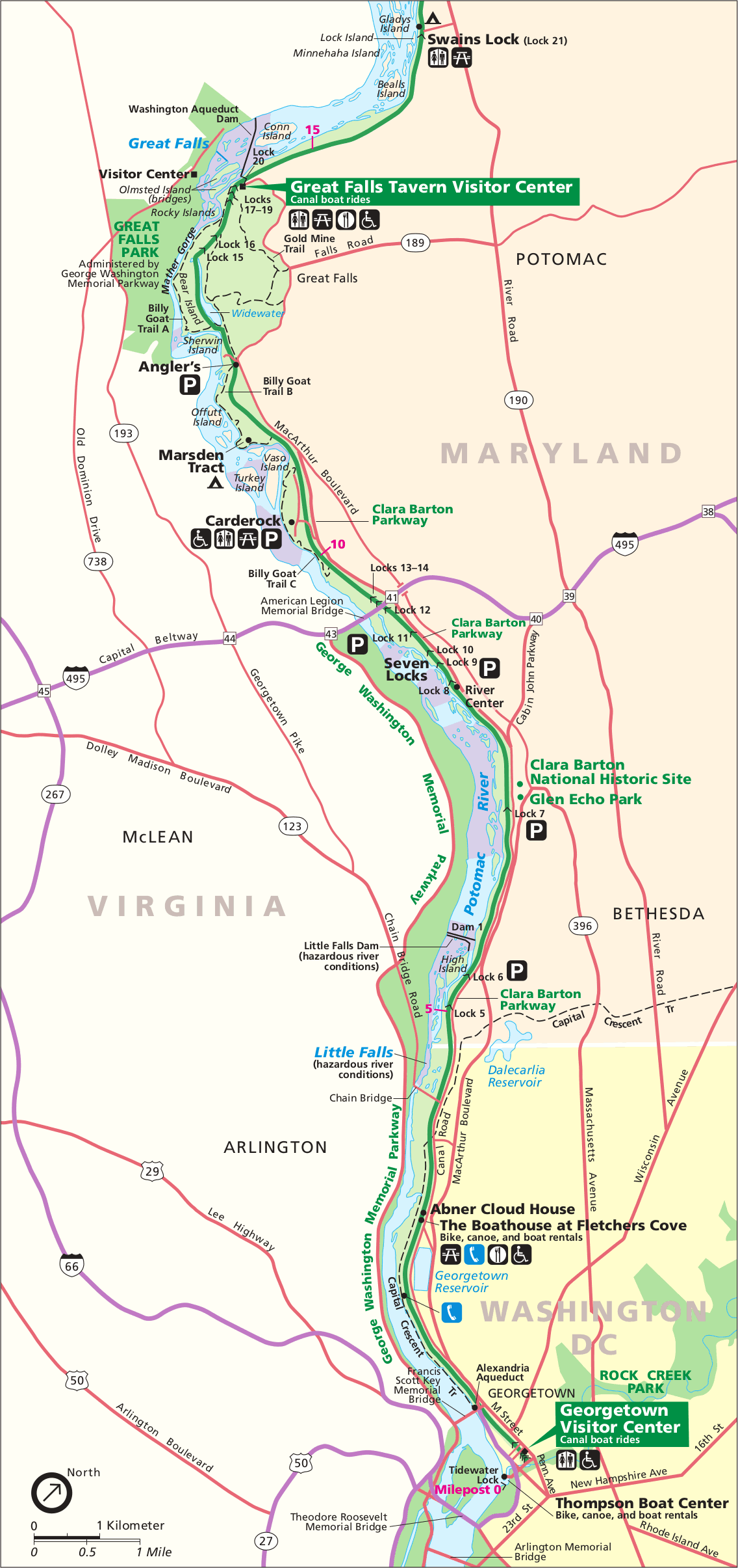 역사공원의 전체 지도를 보여드릴 필요는 없을 것 같고, 작년에 간단히 소개한 적이 있는 운하가 시작되는 조지타운(Georgetown)에서 여기 그레이트폴스까지의 구간 지도만 보여드린다. 여기서 포토맥 강(Potomac River)의 좌우로 녹색으로 표시된 지역과 이름들은 모두 국립공원청(National Park Service, NPS)에서 관리하는 곳이라고 생각하면 된다.