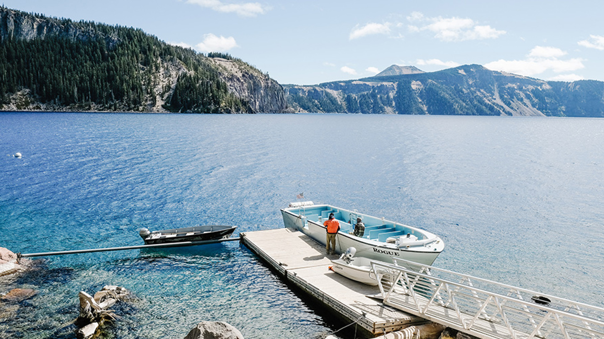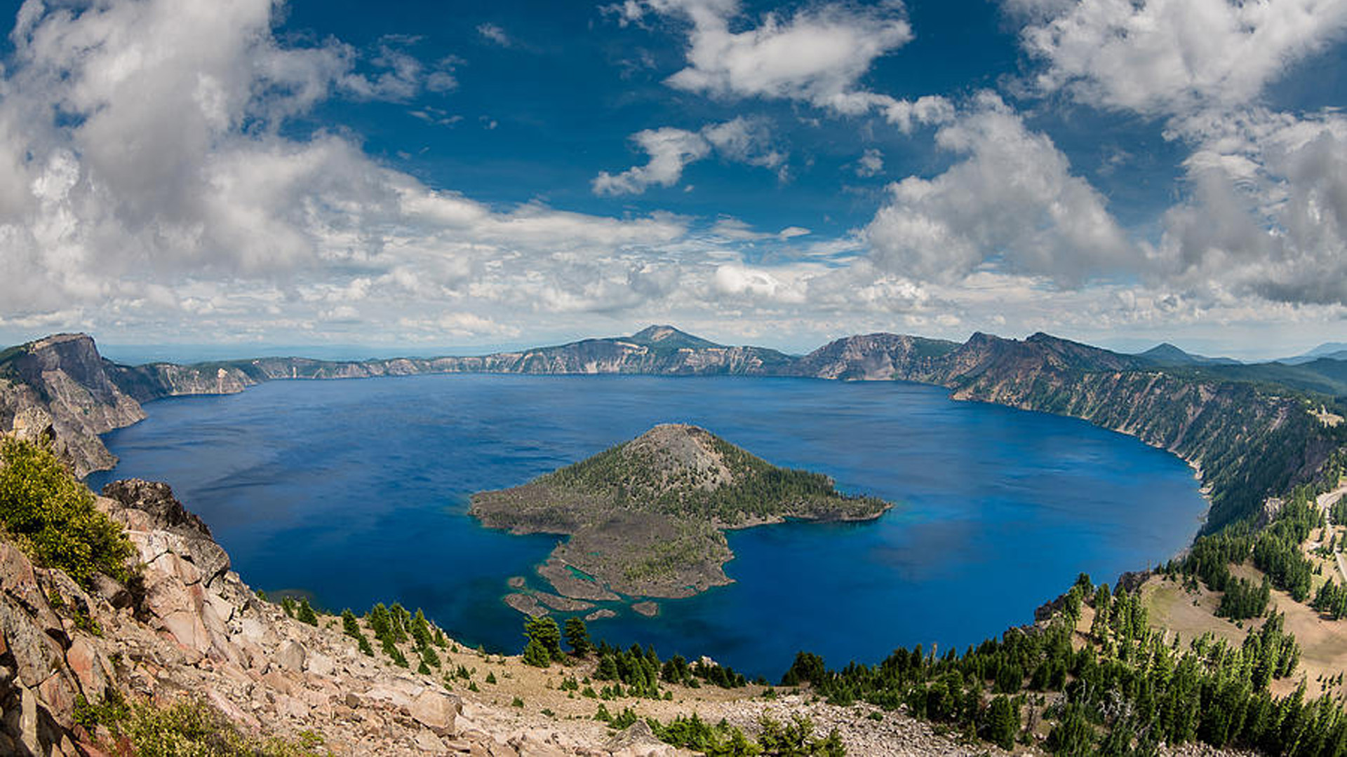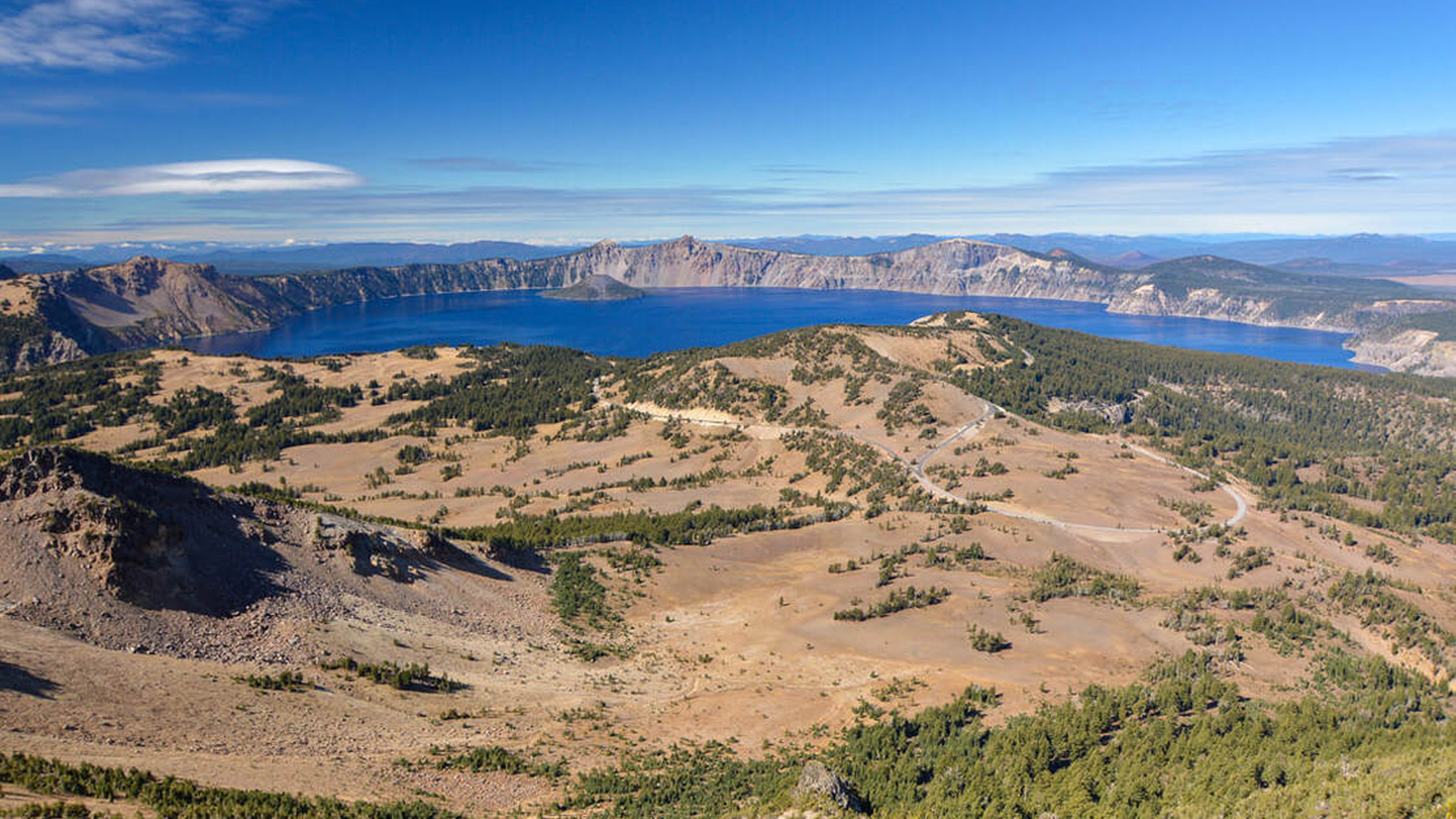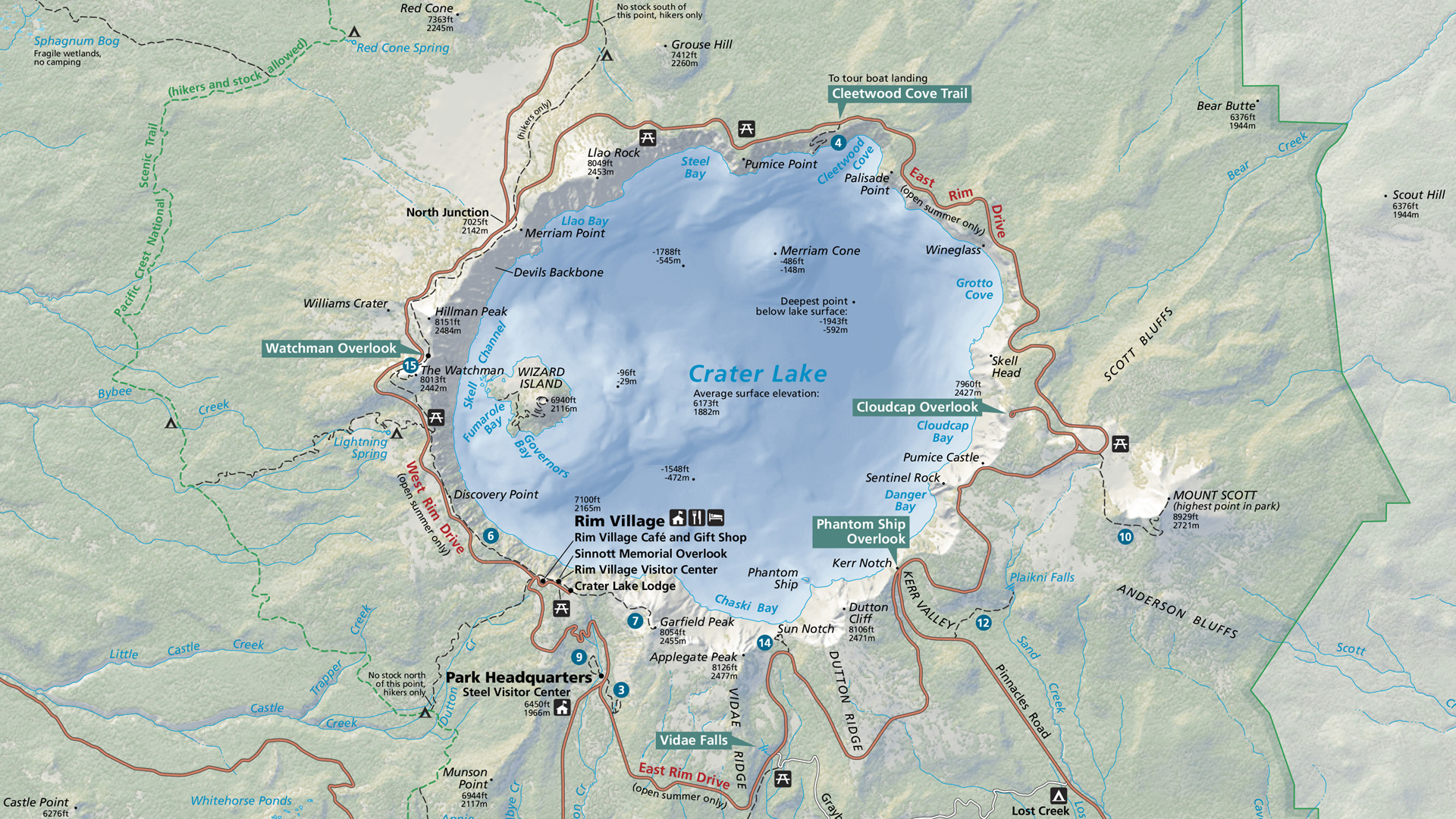 호수의 동쪽에 공원에서 가장 높은 해발 2,721 m의 스콧 산(Mount Scott) 정상까지 등산을 하면 이렇게 멀리서 전체 모습을 내려다 볼 수 있습니다.
