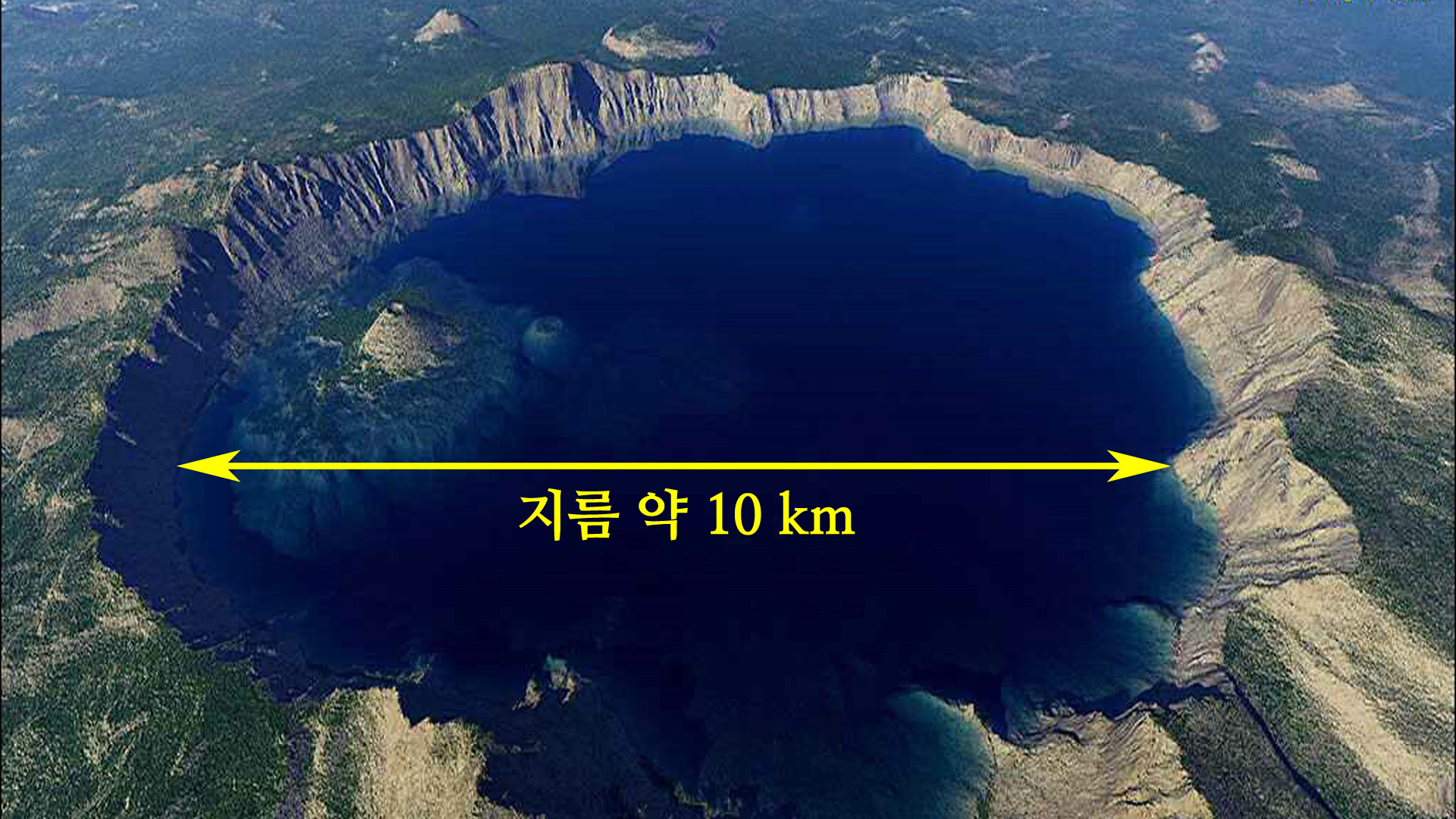 미국 오레곤의 크레이터 호수가 지름은 10 km로 천지의 약 2배, 면적은 5배 이상으로 훨씬 더 큽니다.