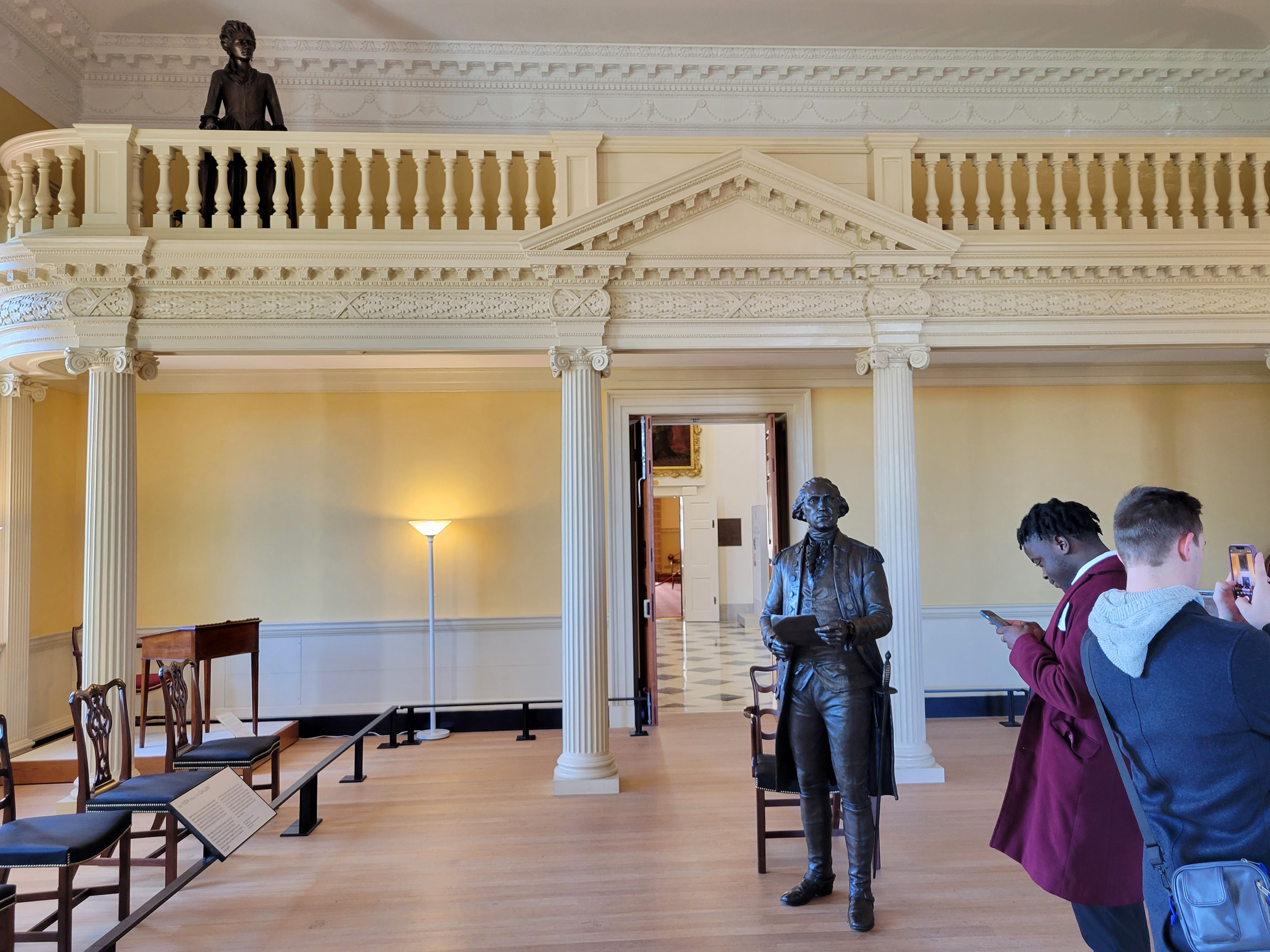 그리고 옛 상원회의장(Old Senate Chamber)의 중앙에 총사령관 사임을 발표하는 워싱턴의 동상이 만들어져 있었다. 위쪽 발코니에서 내려다보고 있는 여성은 워싱턴의 아내일거라 생각했는데 아니고... 전직 메릴랜드 식민지 총독의 딸로 워싱턴과도 친분이 있었던 몰리 리다웃(Molly Ridout)인데, 회의장에는 여성의 출입이 안 되던 시절이라 위에서 내려다 보면서 당시 상황을 아주 상세히 기록을 해놓았다고 한다.