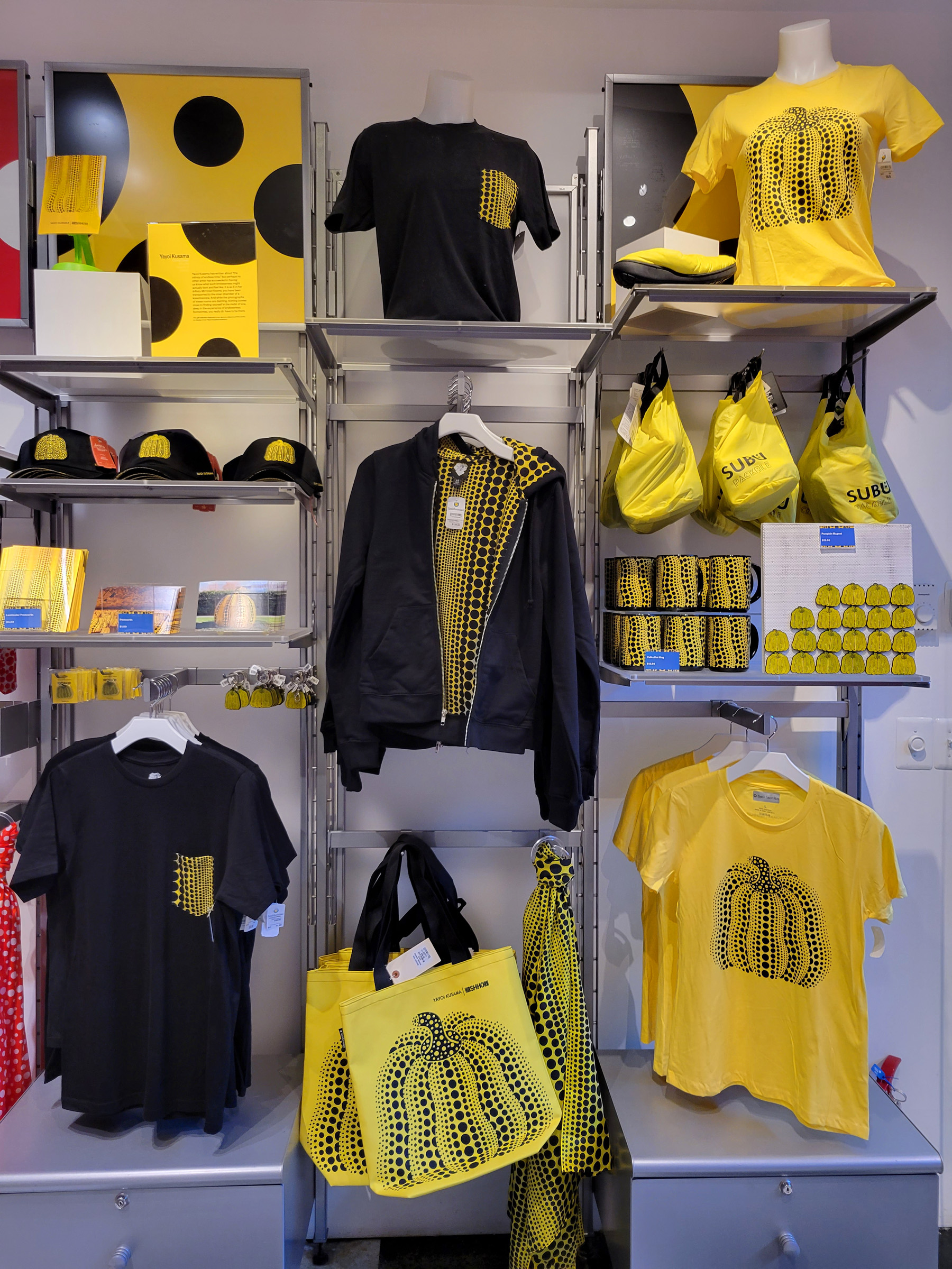 그렇게 야요이쿠사마 특별전 관람을 모두 마치고 나오면, 바로 옆의 지하 기념품 코너에서 노란 땡땡이 호박이 그려진 티셔츠 등을 사실 수도 있게 해놓았다. 참, 전시회 두번째 작품명의 뜻을 알려드리는 것을 까먹었는데... '남근(男根)들의 들판'이다. (phalli는 남자의 성기를 뜻하는 phallus의 복수형) 그리고 그것들에 그려진 빨간색 폴카도트(polka dot)는 성병에 걸린 것을 상징했다고 한다.