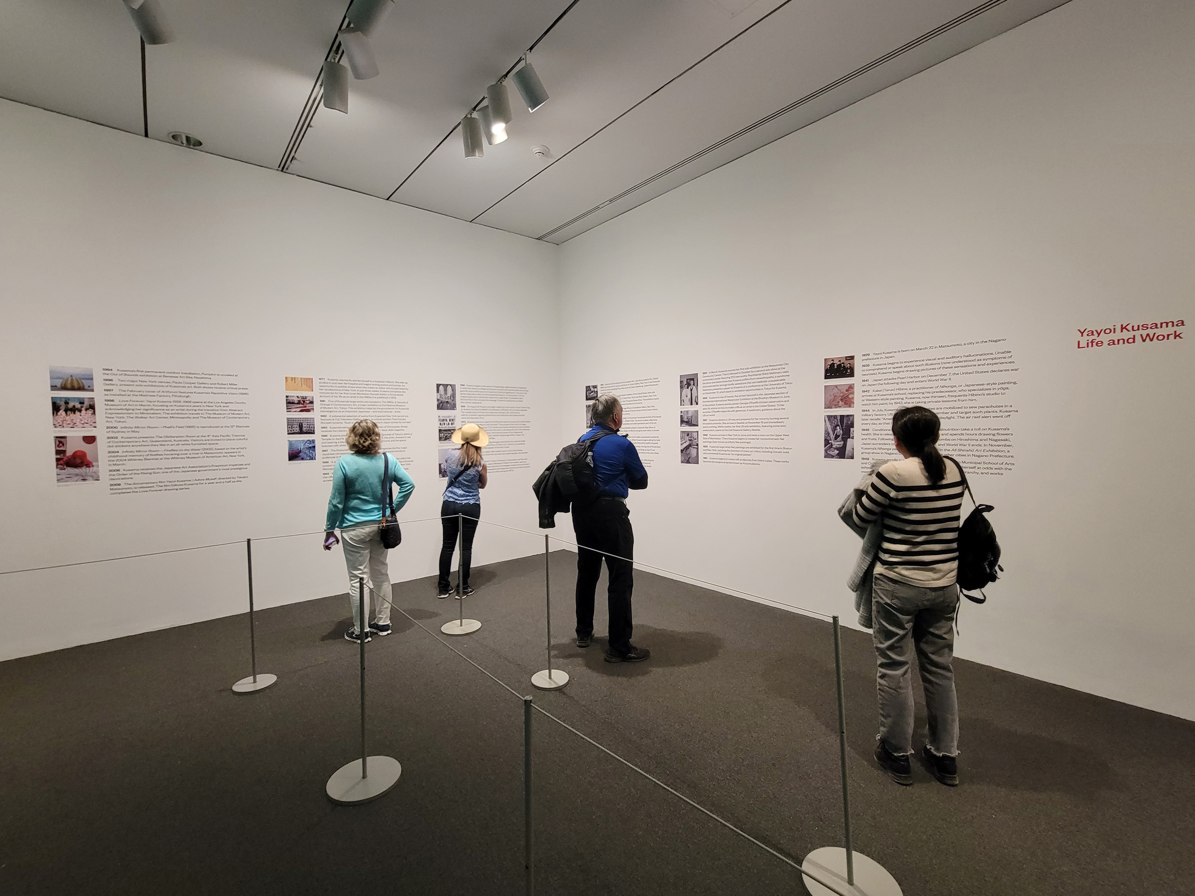 입구에는 먼저 쿠사마 야요이의 일생에 관한 소개가 벽에 작은 글씨로 적혀 있다. 젊은 시절에 뉴욕에서 아방가르드 예술가로 활동하다가 1977년에 일본으로 돌아간 후 나이 48세부터 현재까지 정신병원에 입원한 상태로 작품활동을 하고있는데, 1929년생으로 현재 나이가 무려 94세로 아직 생존해있다.