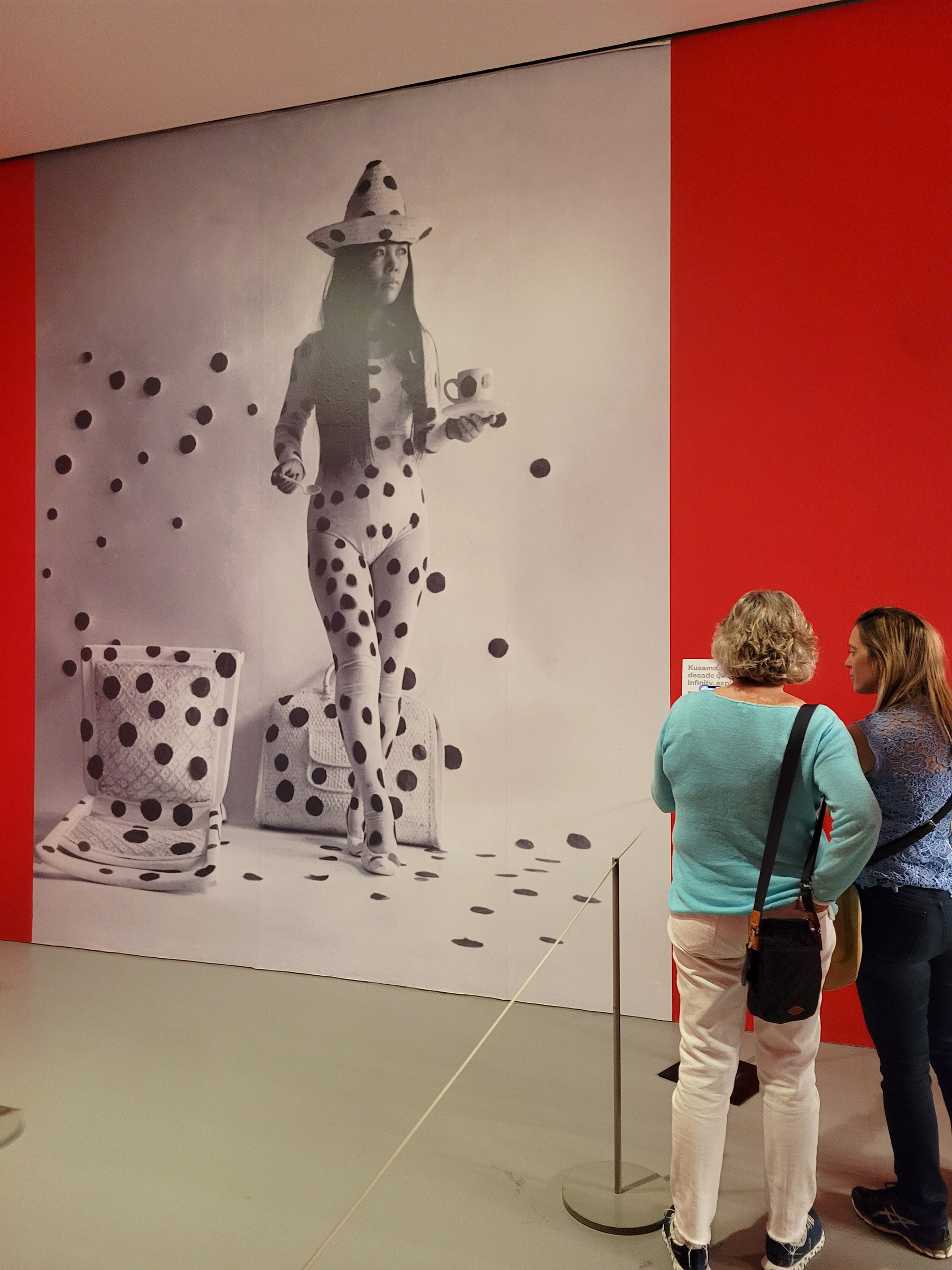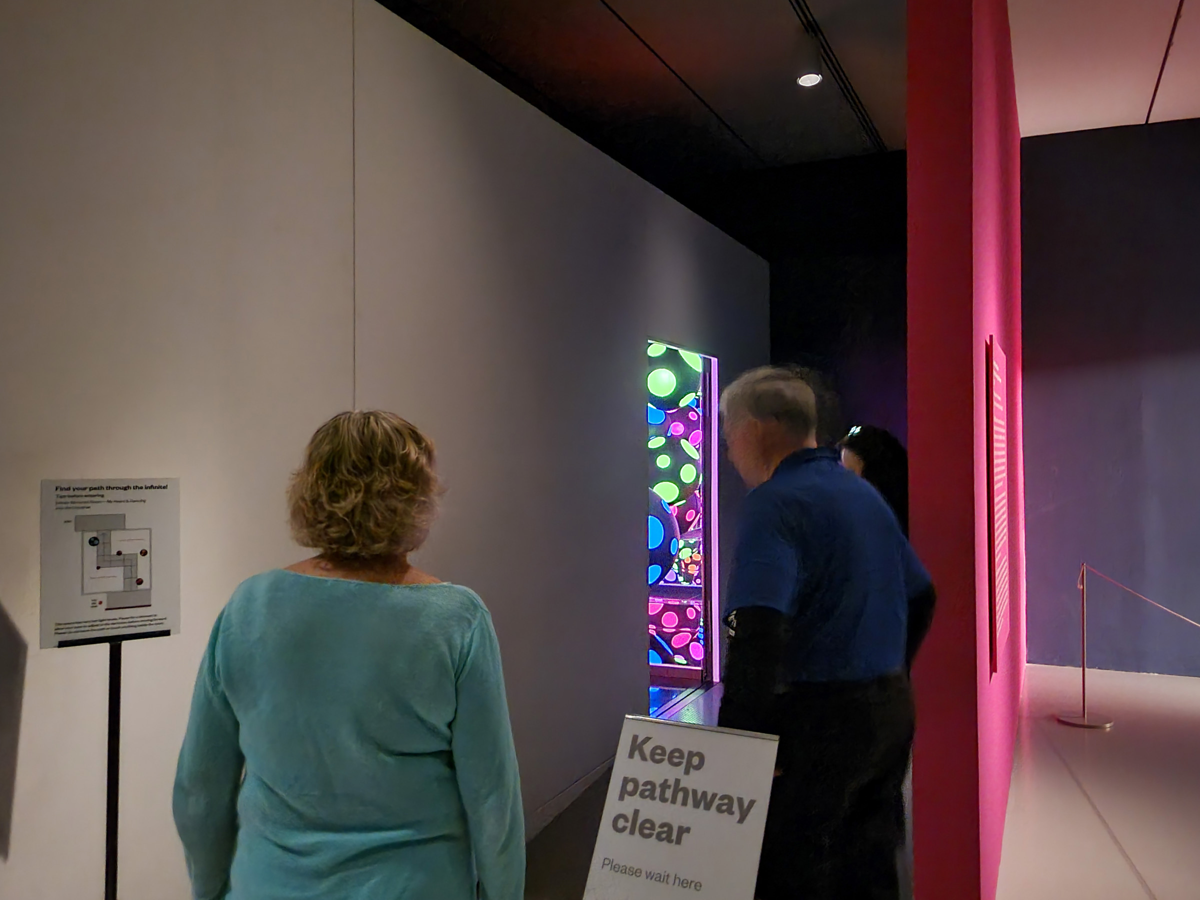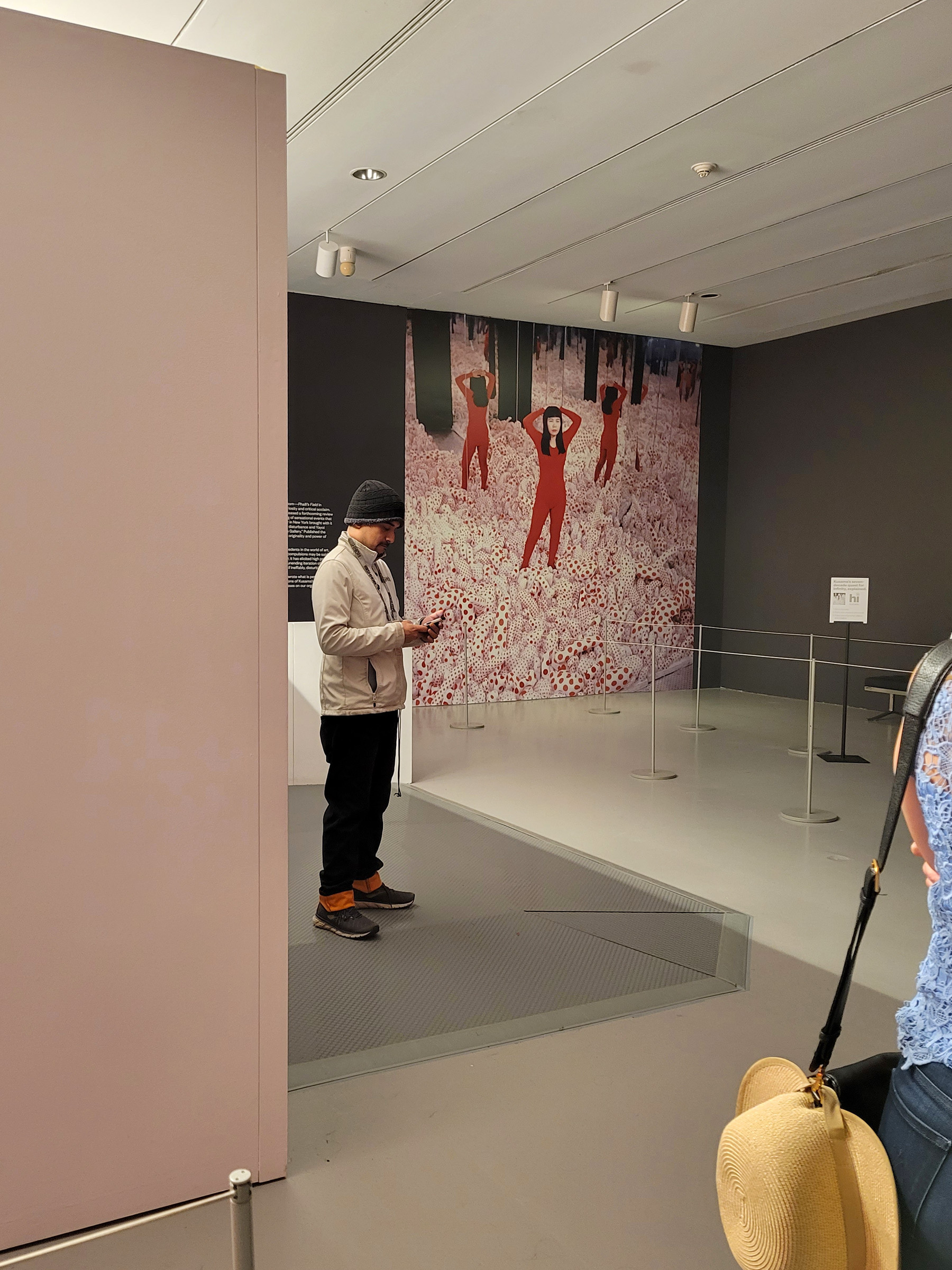 직원이 그 앞에 서서 2~3명씩만 차례로 안에 입장을 시켜서 30초씩만 머물게 했다. 멀리 벽에 붙어있는 사진이 뉴욕에서 그녀가 최초로 거울을 이용한 전시를 선보였던 1965년의 Floor Show 작품인데, 이제 우리가 들어가는 '무한의 거울 방(Infinity Mirror Room)'은 그 작품을 2017년에 재현해서 만든 것이다.