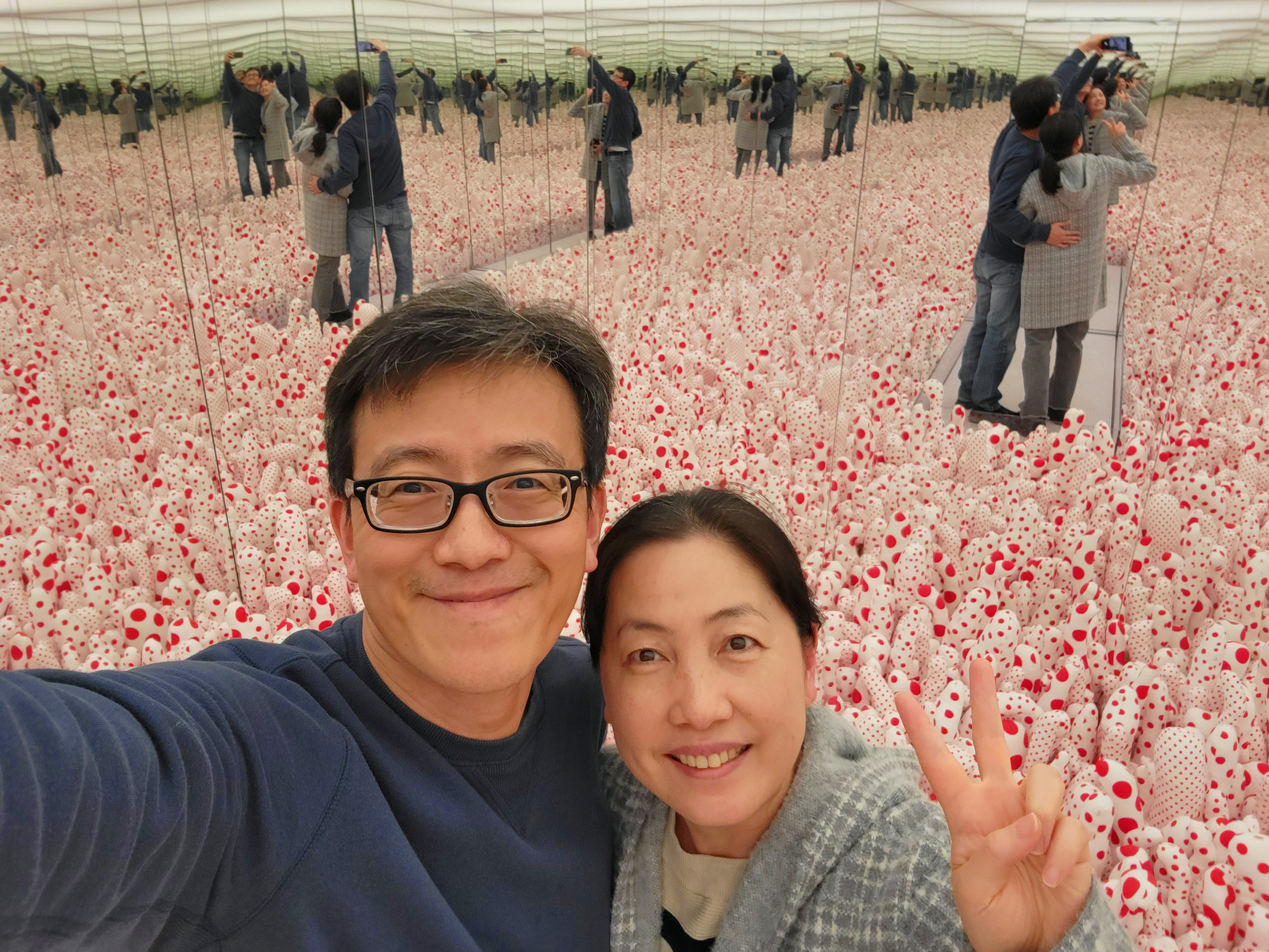 Infinity Mirror Room—Phalli’s Field 작품의 안에 서있는 무한히 많은 커플의 셀카이다.^^ (밖에서 입장하는 것부터 안에서 한바퀴 둘러보는 모습은 포스팅 제일 아래의 동영상을 클릭해서 보실 수 있음)