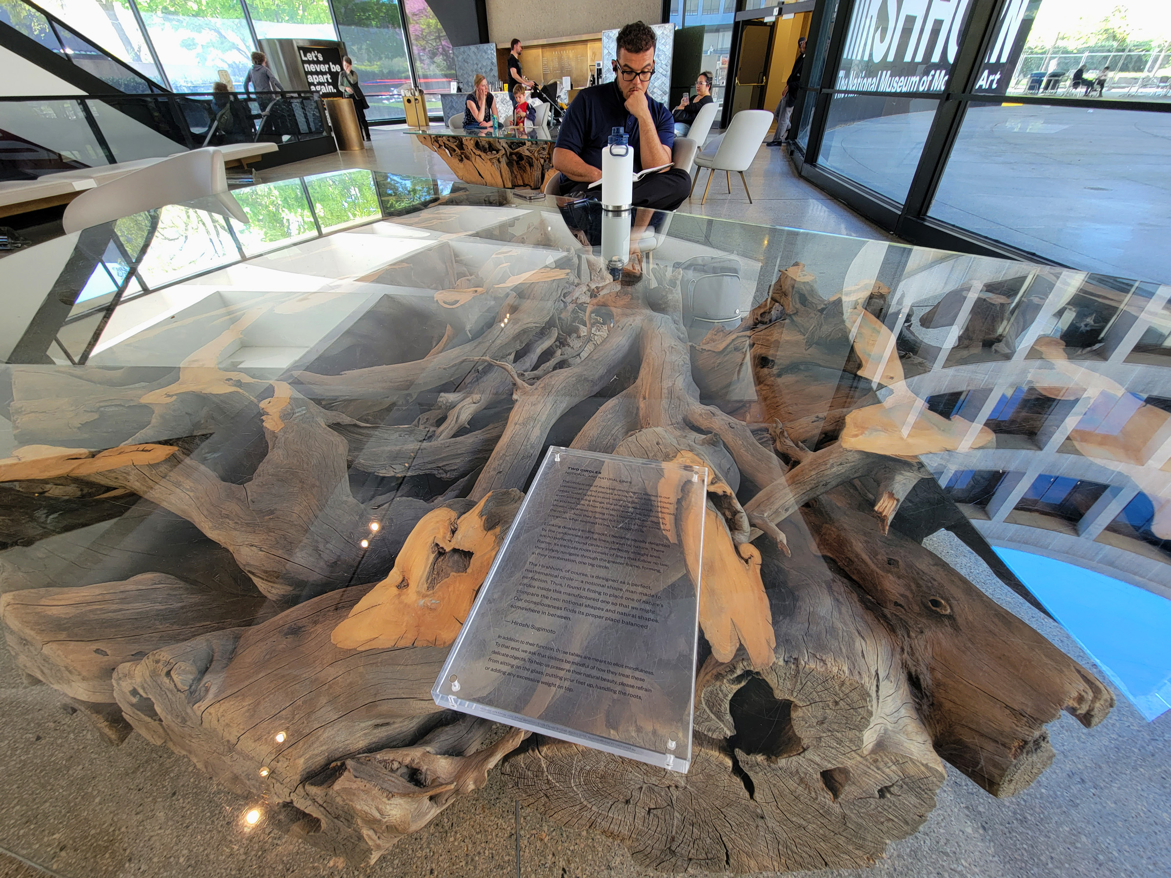 조각정원이 안 여는 바람에 시간이 남았지만 2~3층은 올라가지 않고, 그냥 여기 1층 로비의 의자에 앉아서 시간을 보냈다. 커다란 나무뿌리를 뒤집어서 반으로 자른 다음에 각각 반원형의 강화유리를 올려서 만든 테이블이 2개 놓여져 있는데, 일본인 Hiroshi Sugimoto의 Two Circles 작품이다.