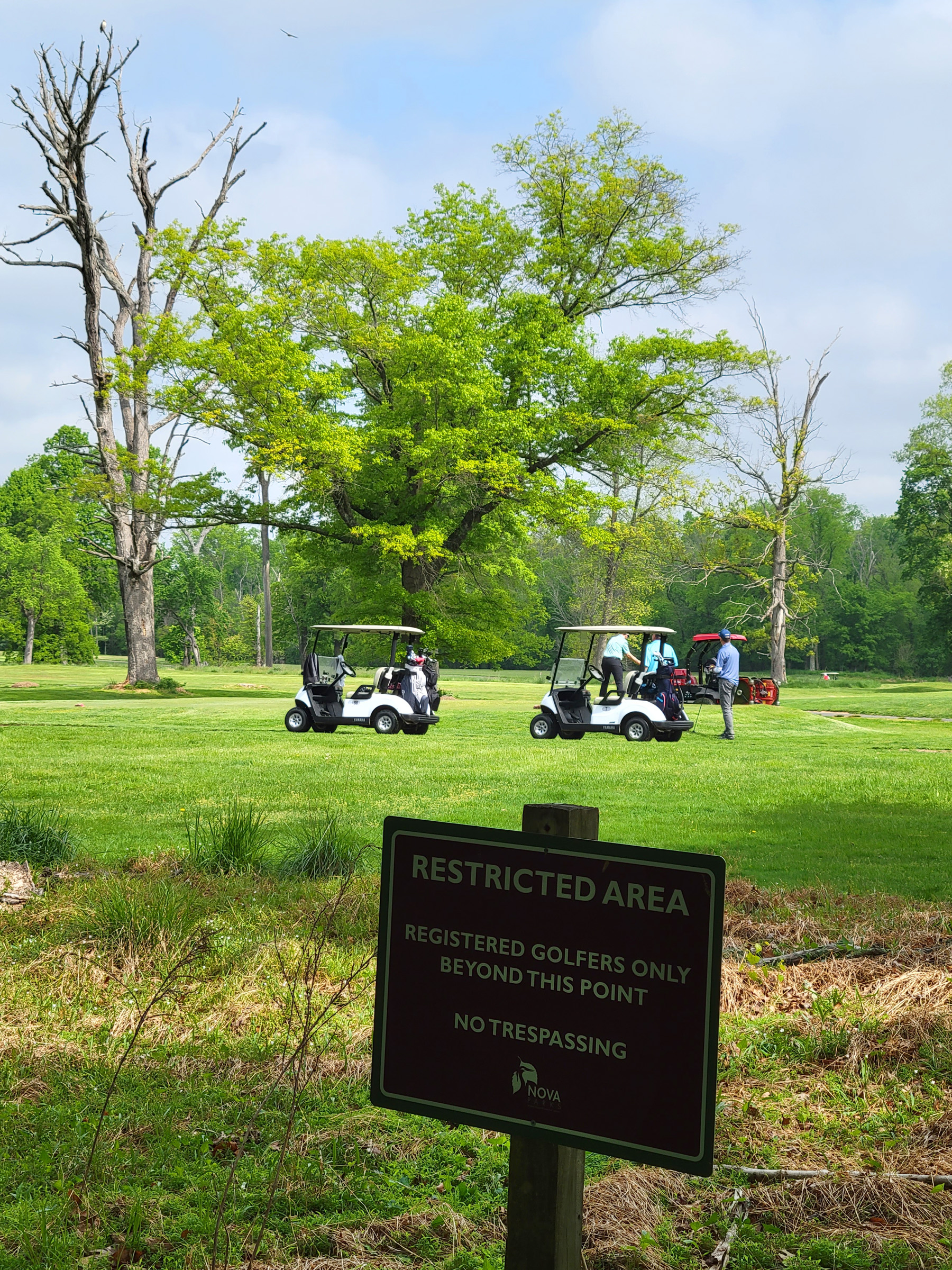 여기서 올드슈거랜드런(Old Sugarland Run)을 따라 PHT는 계속 이어져서, 직전에 다녀왔던 세네카 지역공원까지 연결이 되지만, 골프코스 사이로 만들어진 트레일을 더 걸을 필요는 없을 것 같아 돌아섰다. 사진 오른쪽에 보면 TV 중계를 위해 만들어 놓은 타워가 보이는데, 요즘 PGA 투어의 경쟁자로 떠오른 LIV 골프 토너먼트 대회가 5월말에 여기서 열리기 때문이다.