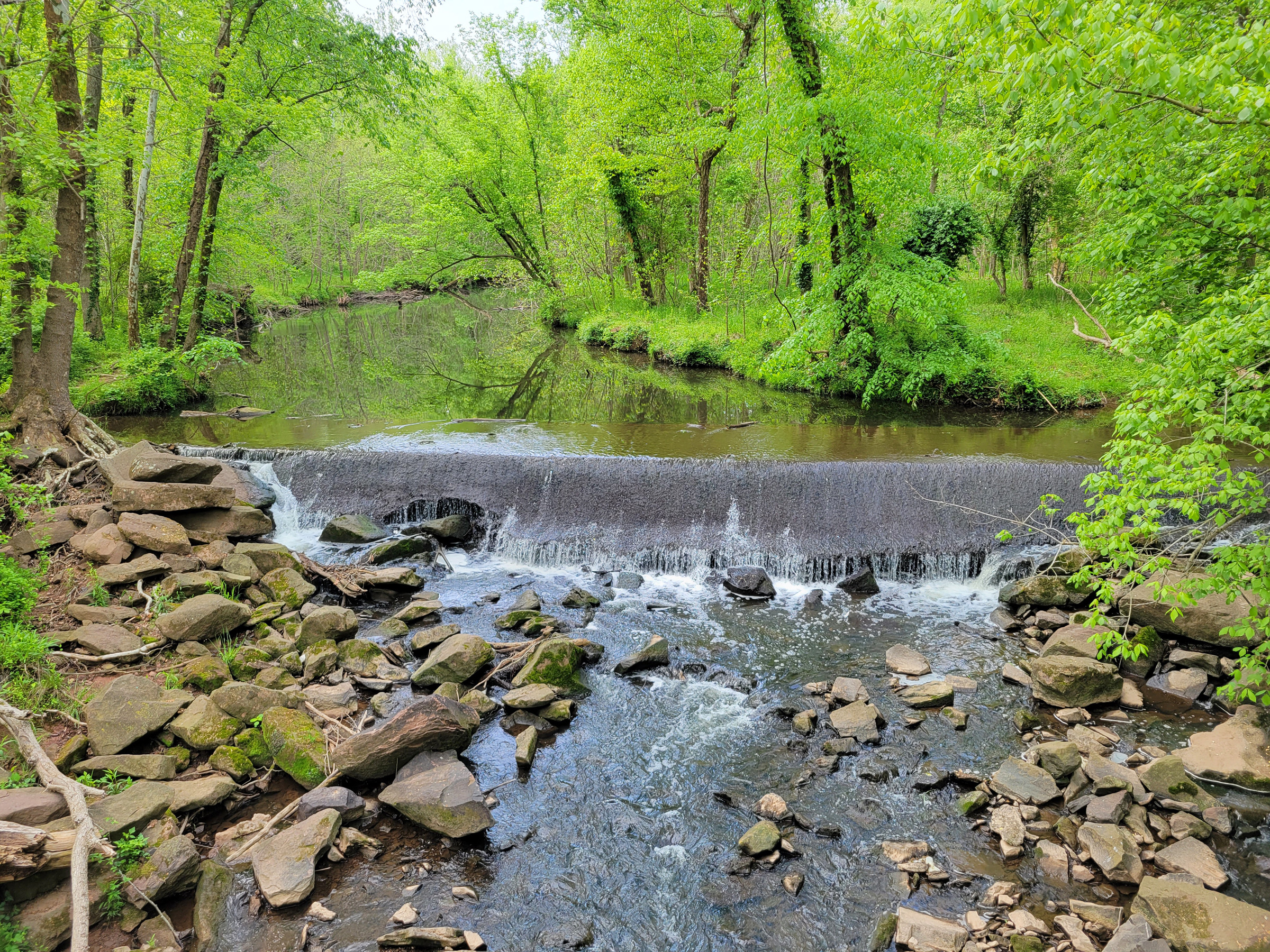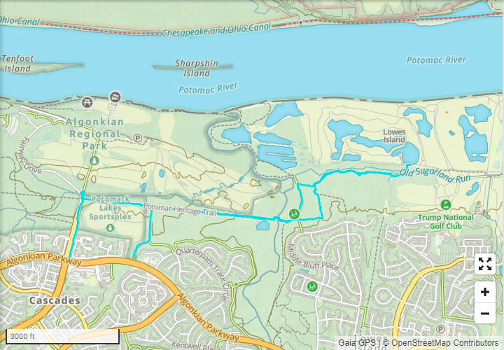 가이아GPS로 기록한 경로가 하늘색으로 표시되어 잘 보이지는 않는다. Algonkian Parkway를 건너서 주택가 사이로 만들어진 산책로에서 시작해, 지도 오른편 Old Sugarland Run 표시까지 갔다가 유턴을 해서, 공원의 정문에 해당하는 캐스케이드(Cascades) 길을 따라 사거리로 나왔다. 제목에는 산책이라고 했지만 1시간 20분 동안에 7 km를 걸어서 제법 힘든 운동을 한 셈이다.