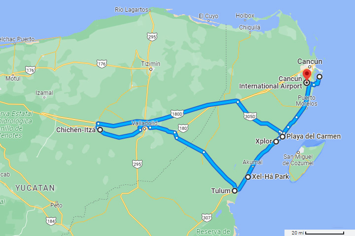 멕시코 유카탄(Yucatan) 반도의 동쪽 끝인 칸쿤 지역을 직접 렌트카를 운전해서 돌아다닌 대강의 여행경로이다. 도착한 일요일 점심때부터 월요일까지는 호텔존의 '성인전용 올인클루시브(Adults Only All Inclusive)' 리조트를 벗어나지 않았고, 화요일에는 제일 남쪽의 툴룸(Tulum) 유적지를 구경한 후에 나머지 4박을 하는 플라야델카르멘(Playa del Carmen)의 숙소로 옮겼다. 수요일에는 빼먹을 수 없는 치첸이사(Chichen-Itza)와 함께 세노테 3곳을 들렀고, 목요일과 금요일에는 지도에 표시한 두 곳의 물놀이 공원을 각각 하루씩 방문한 후에, 토요일 오전 비행기로 미국으로 귀국하는 일정이었다.