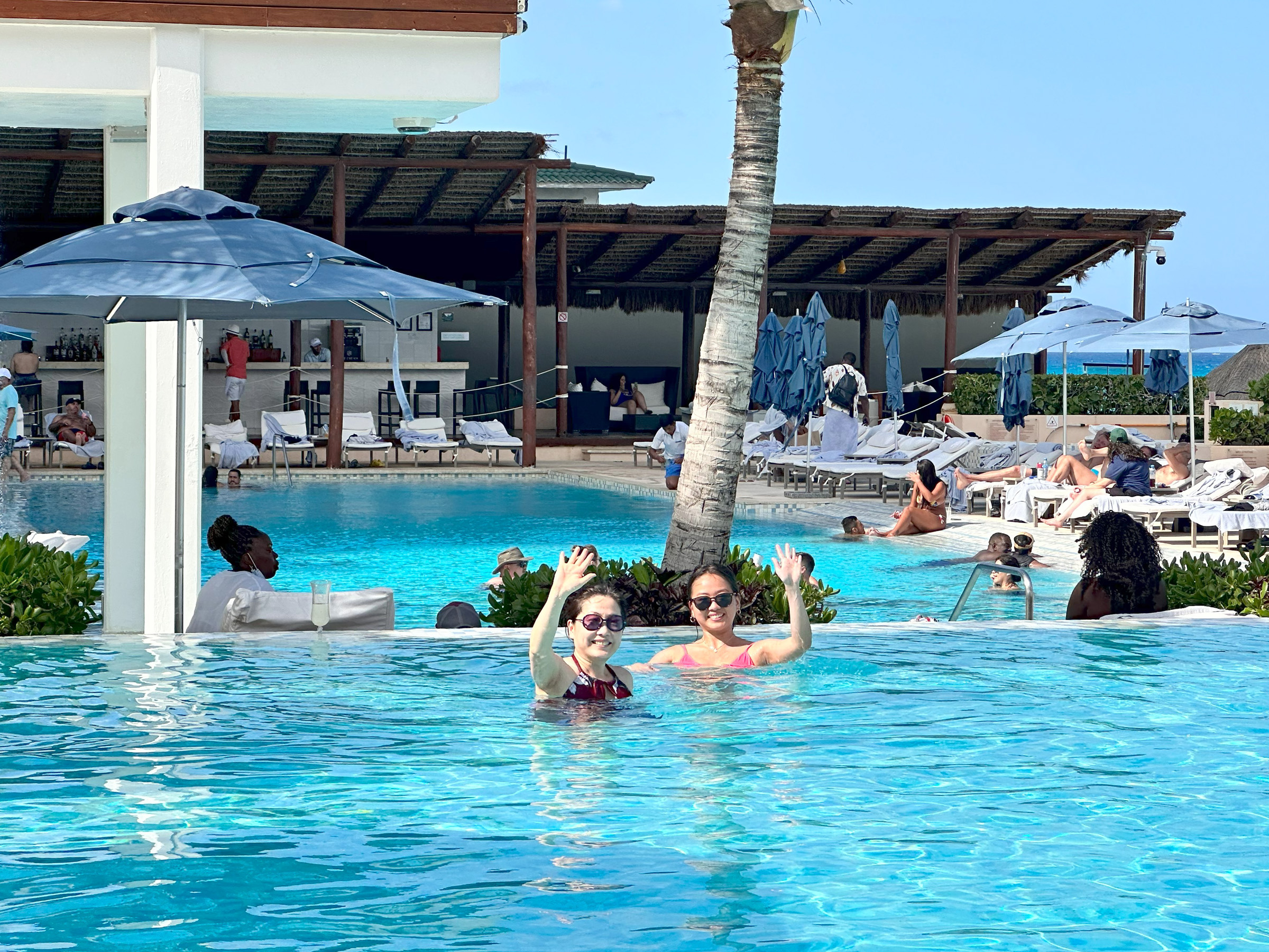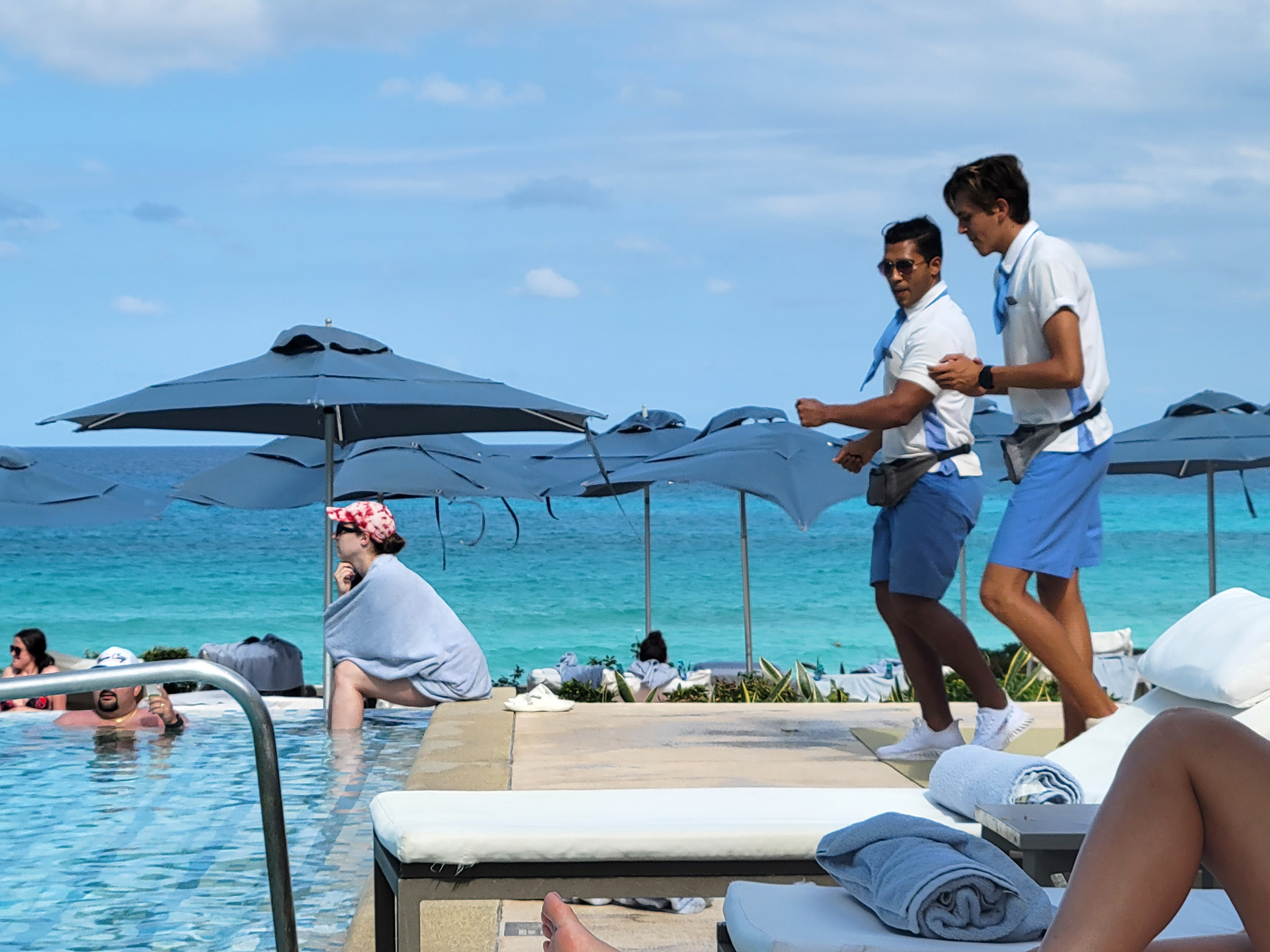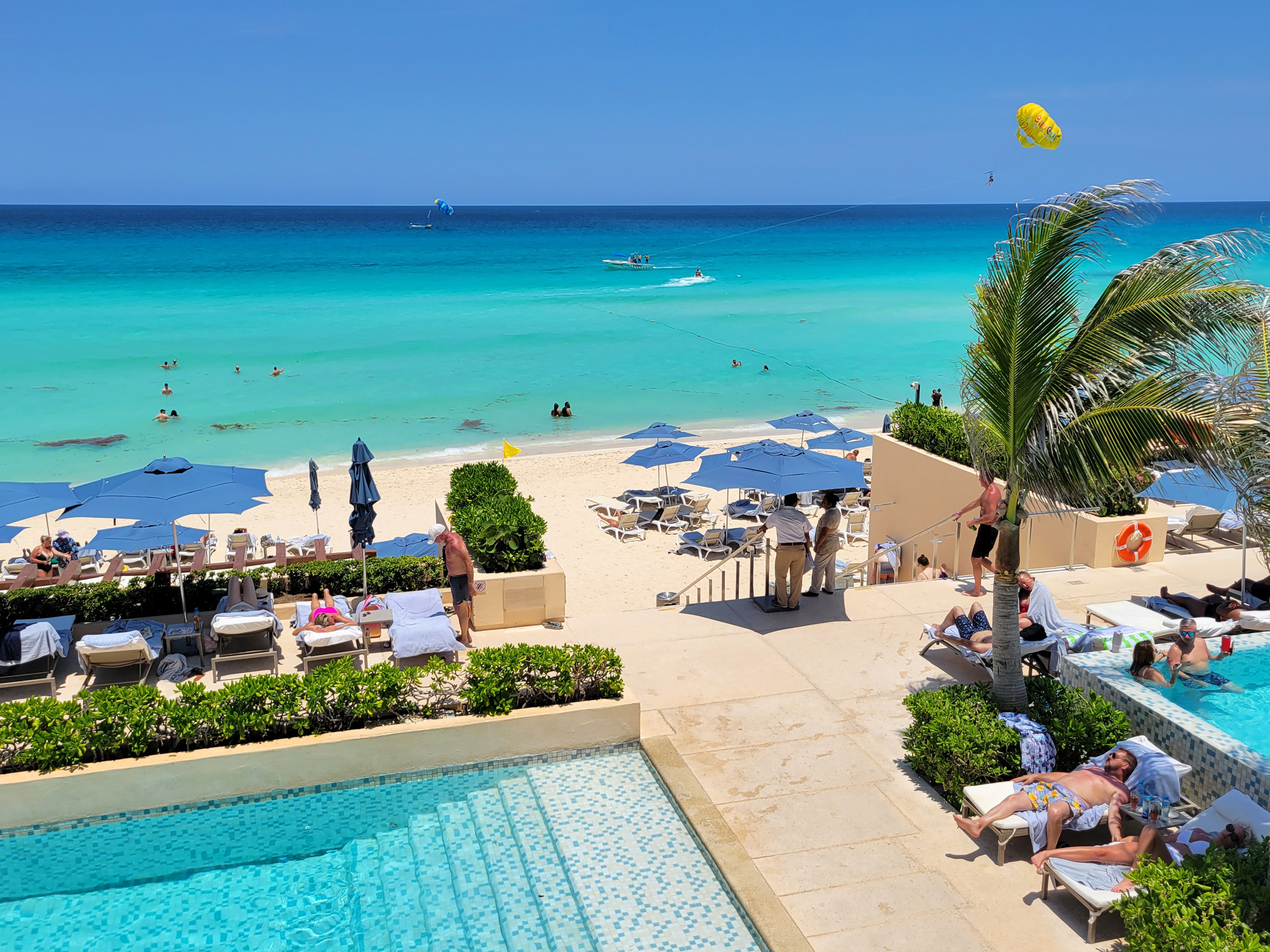 칸쿤은 6월이 우기라서 날씨가 안 좋으면 어떡하나 걱정을 했는데, 이렇게 맑은 날씨에 예쁜 물색깔을 볼 수 있어서 아주 감사했다. 또 이 시기에는 왼편에 검게 보이는 해초류가 많이 떠내려와서 불만이라는 분들도 계시던데, 다음날 우리는 저 우뭇가사리 같은 걸 뭉쳐서 비치발리볼 대신에 던지면서 재밌게 놀았다.