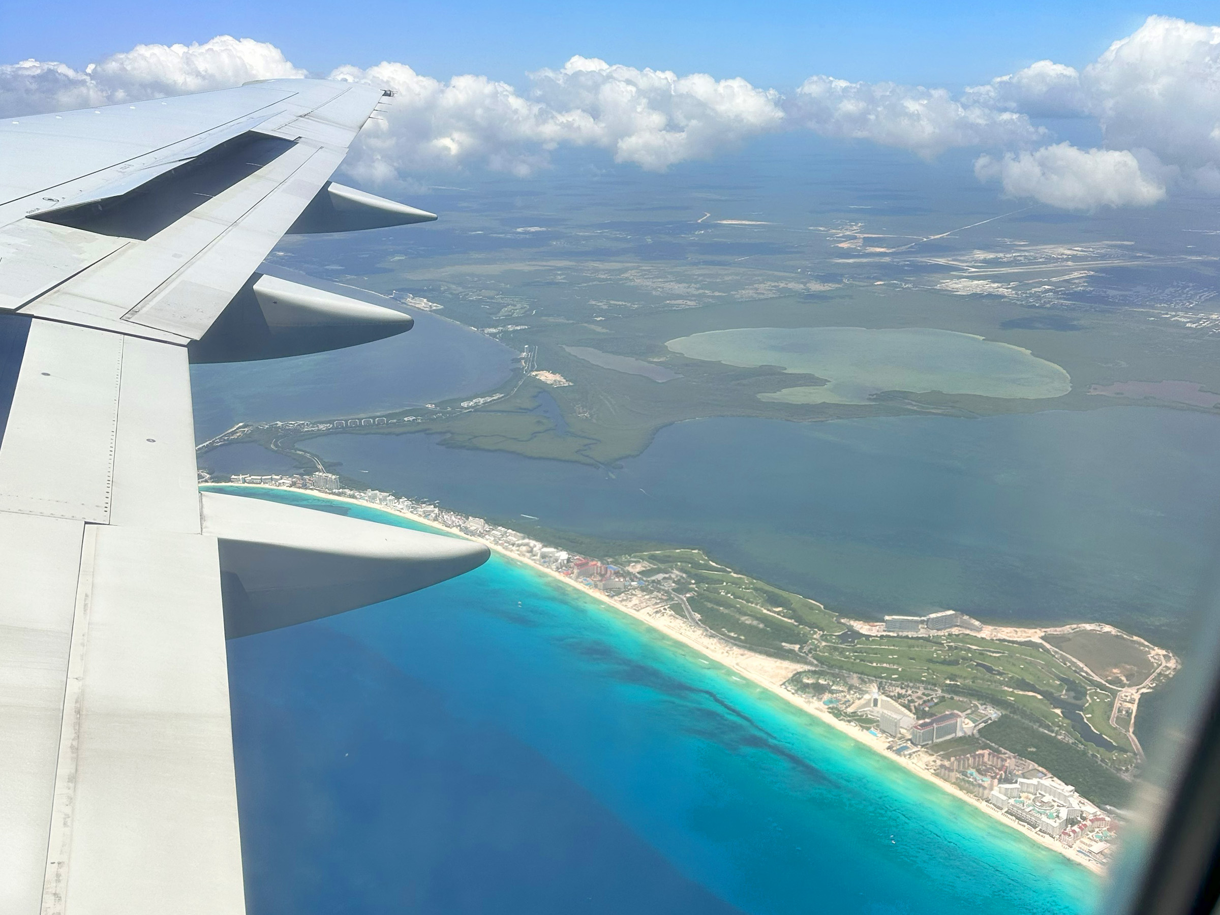 약 2시간반 정도 걸려서 칸쿤 상공에 도착해 우측 멀리 보이는 활주로에 착륙하기 위해 선회를 할 때, 남북으로 기다란 평행사도(barrier islands)인 소위 '호텔존(Hotel Zone)'의 동쪽으로 확연히 구분되는 옥색의 해안가가 내려다 보였다.