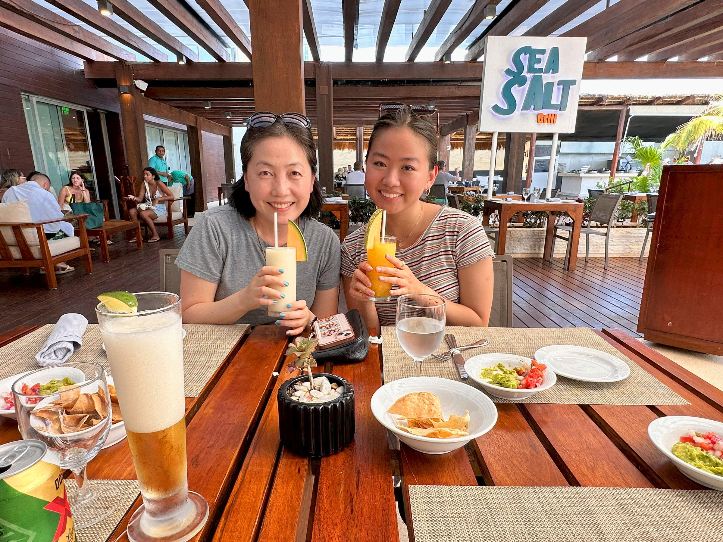 방번호도 안 나왔지만 일단 리조트 안에 들어오기만 하면 먹고 마시는 모든게 공짜라서, 풀장 옆에 있는 캐쥬얼한 야외 식당에서 점심부터 먹었다. 모녀가 들고 있는 칵테일과 앞에 놓인 시원한 '세르베짜(Cerveza)'와 함께...^^ (체크아웃한 날도 오후 5시까지 식음료 이용 가능)