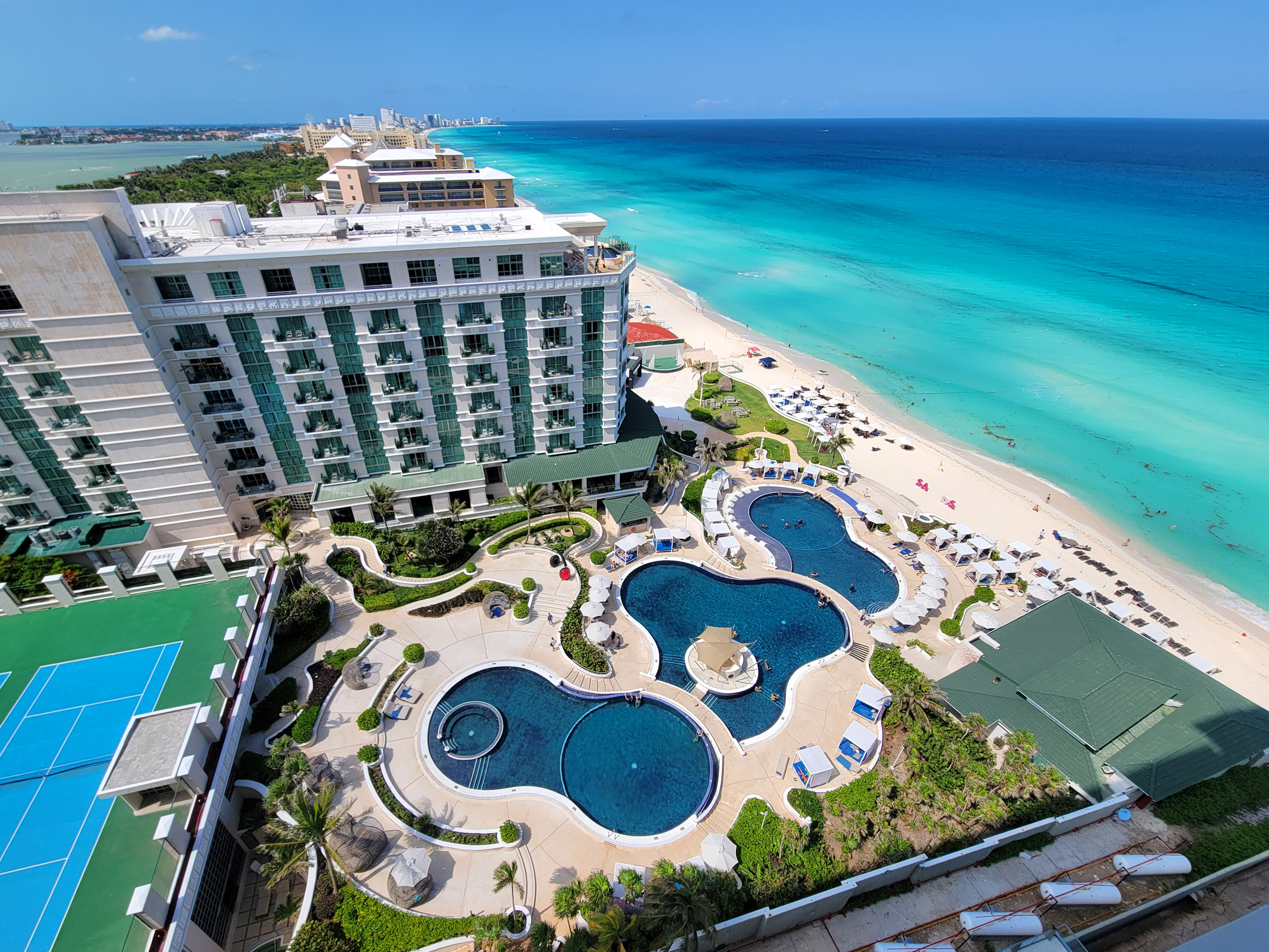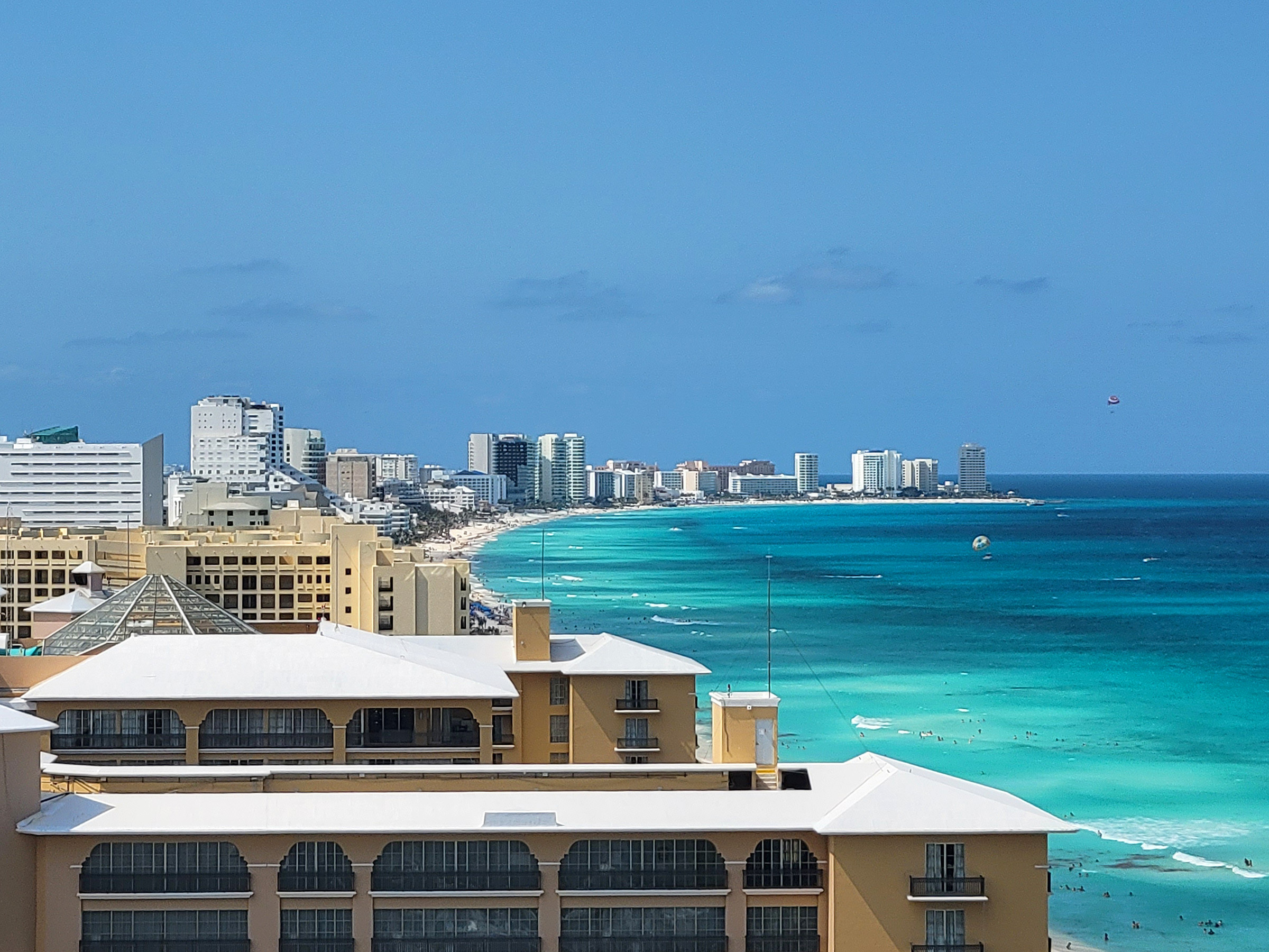 하얏트 멤버라고 북쪽 오션뷰로 업그레이드를 받은 20층의 우리 객실 발코니에서 내다 본 칸쿤 호텔존의 풍경이다.