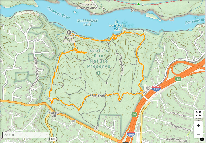 같은 강변의 숲이기는 하지만, 위기주부가 하이킹을 하러 찾아간 곳은 CIA 본부는 아니고... 495번 고속도로 서쪽에 있는 스코츠런 자연보호구역(Scott's Run Nature Preserve)이었다. (구글맵으로 위치를 보시려면 클릭)
