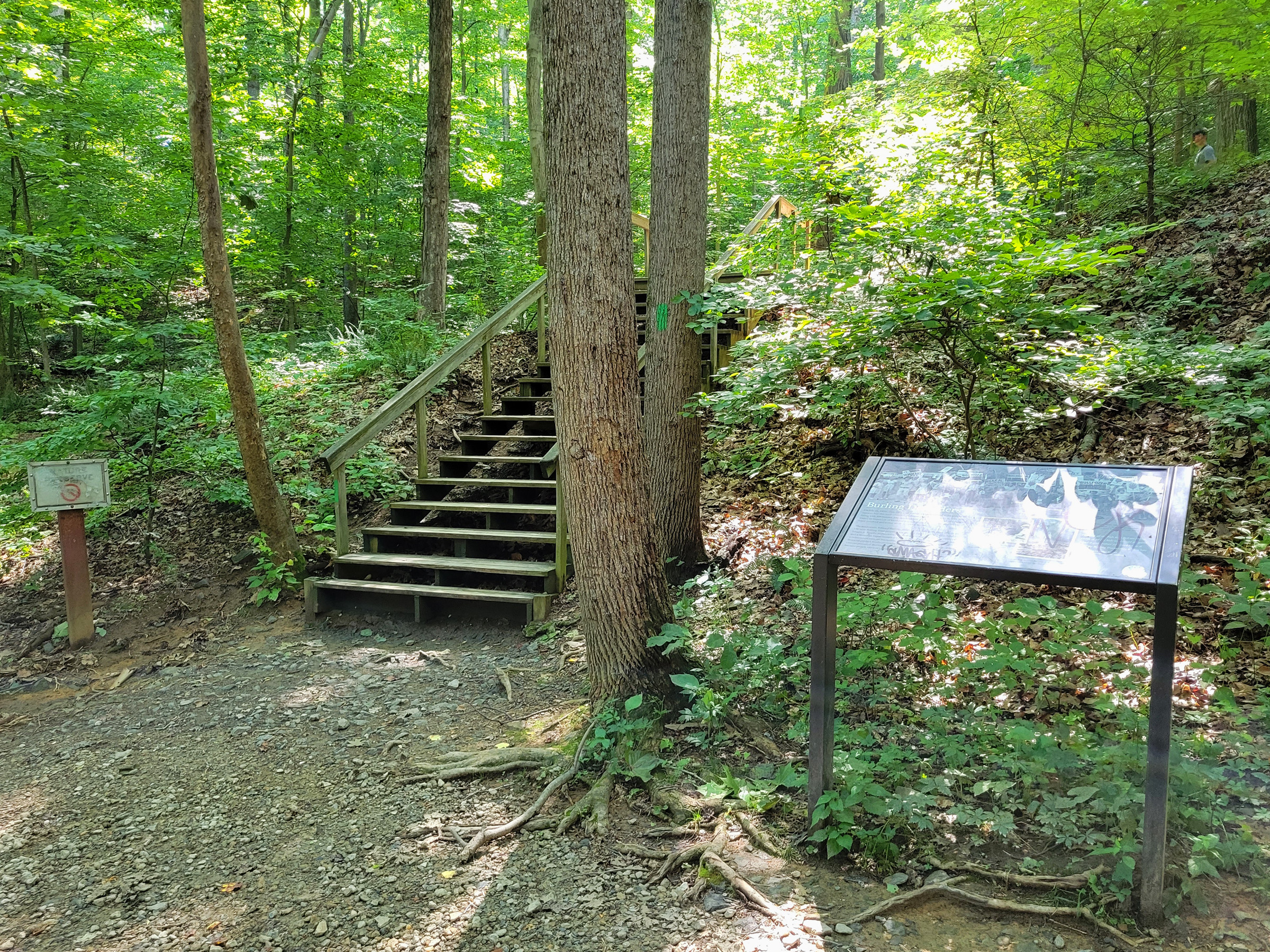 오르막이 끝나는 곳에 더 언덕 위로 올라가는 계단이 잘 만들어져 있고, 그 오른편 안내판에 여기 자연보호구역이 어떻게 만들어졌는지에 대한 설명이 적혀있다. 336에이커의 이 땅은 에드워드 벌링(Edward Burling)의 개인소유였는데, 1966년에 그가 죽은 후에 상속인들이 먼저 정부에 땅을 팔아 공원으로 만들고자 했지만, 양측의 가격이 맞지 않아서 불발되고, 결국 부동산 개발업자에게 이 땅을 팔게 된다.