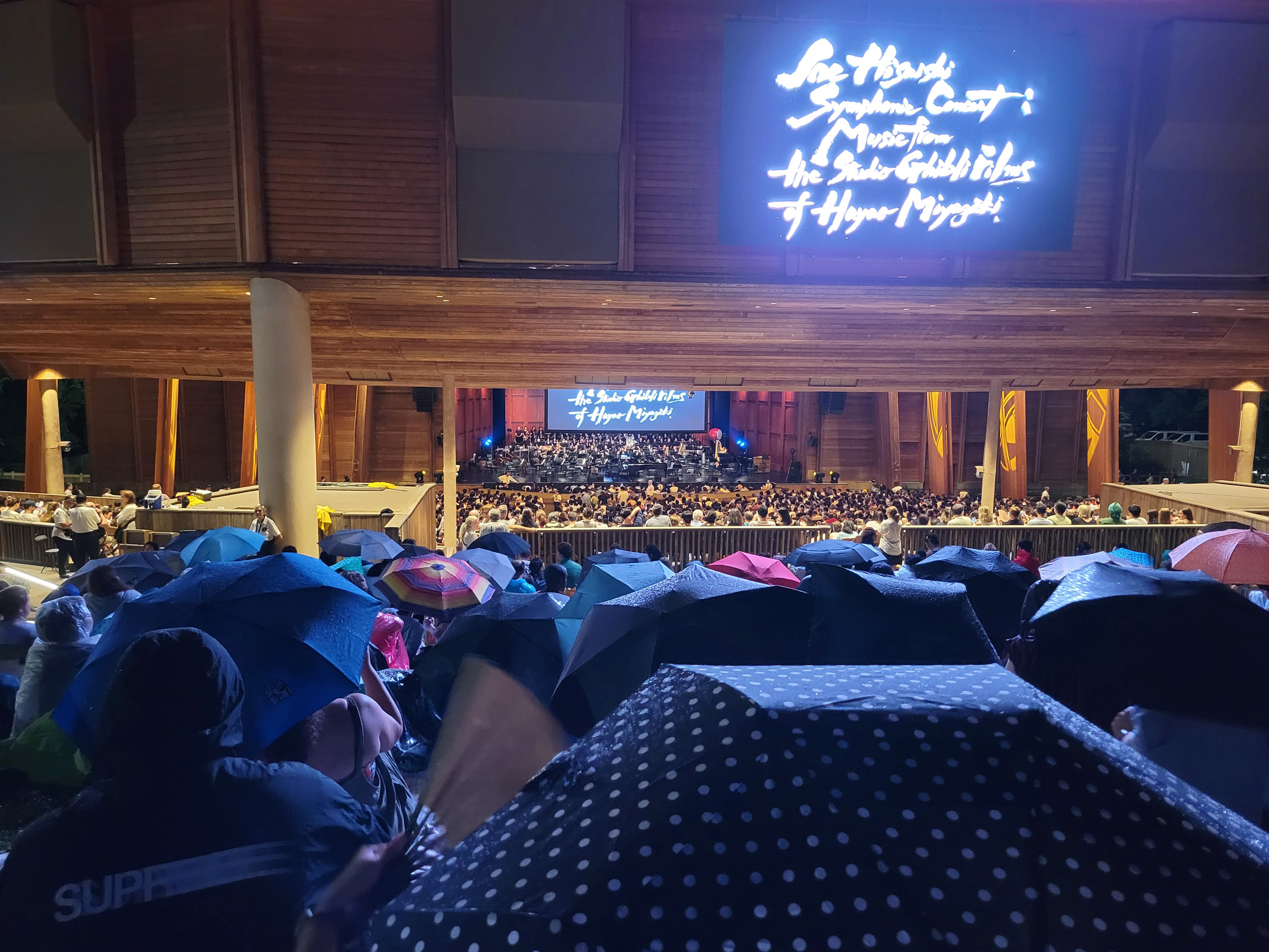 2부 시작을 알리는 종소리가 들릴 때는 비가 제법 내려서 이렇게 잔디밭은 모두 준비해 온 우산들로 덮였다. 그러고 보니 LA에서는 헐리우드보울 공연을 보러갈 때, 비가 올 걱정을 한 적이 없었던 것 같은데...ㅎㅎ 여기는 공연 중에 아무리 폭우가 내려도 뒷자리의 환불은 안 되고, 앞쪽 지붕이 있는 좌석의 1층과 2층에 빈 자리나 통로로 이동이 가능하다고만 되어 있었다. 다행히 이 때까지는 모자로 버틸 수 있는 수준이라서 남편들은 그냥 비를 맞으며, 하늘에서 떨어지는 소녀의 모습으로 시작하는 <천공의 성 라퓨타> Castle in the Sky 음악을 감상했다.