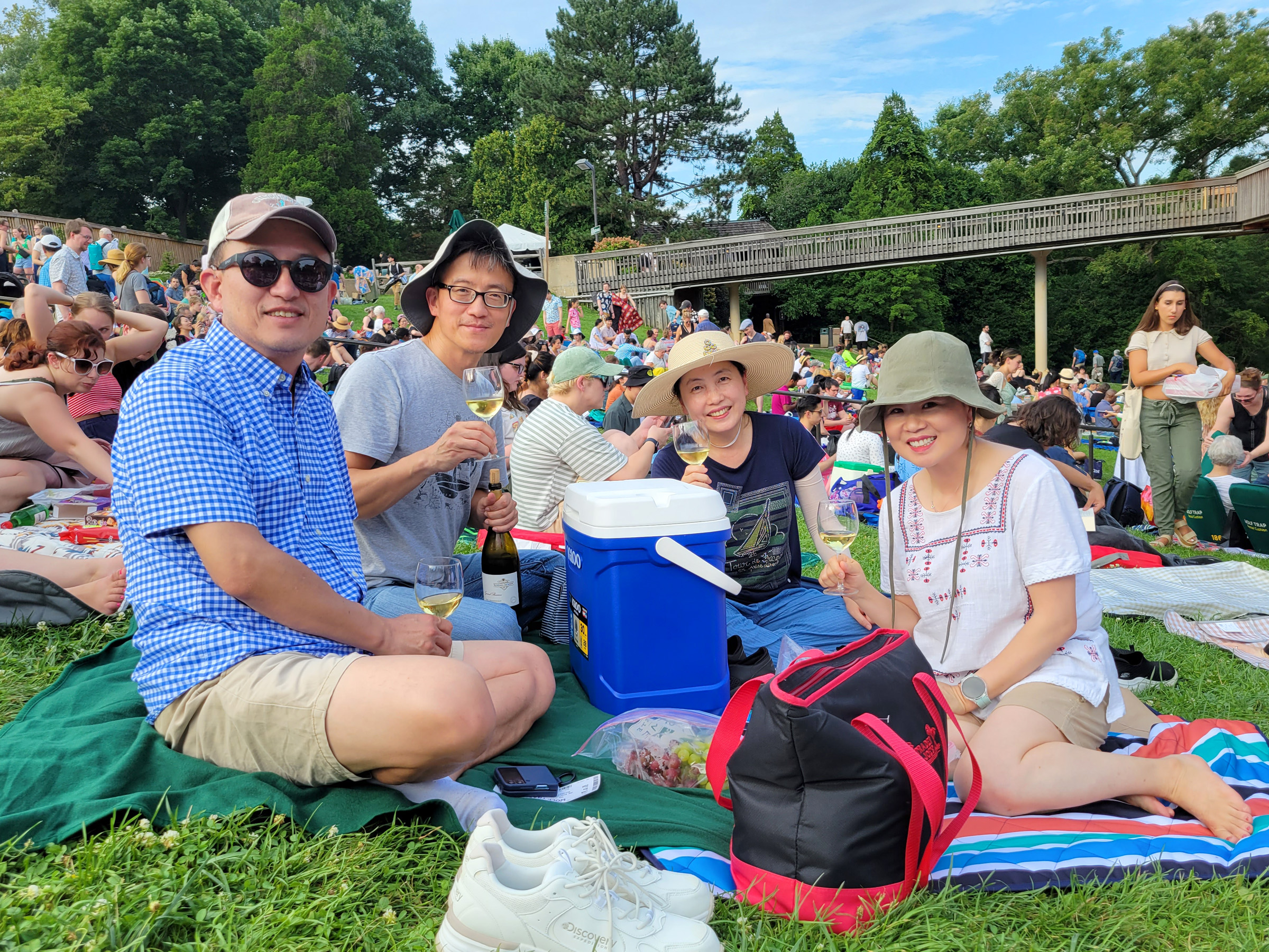 정말 오래간만에 해보는 잔디밭 피크닉으로, 친구분 따님이 만들어 준 샌드위치를 우아하게 유리잔 와인과 함께 즐겼다. 여기서 LA의 유명한 헐리우드보울(Hollywood Bowl)과 비교하지 않을 수 없는데, 주차장과 야외극장 주변으로 엄청나게 많은 피크닉 테이블이 있고 또 제일 앞자리에도 식사를 위한 테이블까지 구비된 박스석이 있는 LA와는 달리 (옛날 포스팅의 사진들을 보시려면 클릭), 여기는 밖에 테이블이 조금 있기는 했지만 대부분 그냥 잔디밭에서 피크닉을 하며, 지붕이 있는 앞쪽 좌석에서는 음식물을 먹을 수 없다는 것이 가장 큰 차이점이었다.