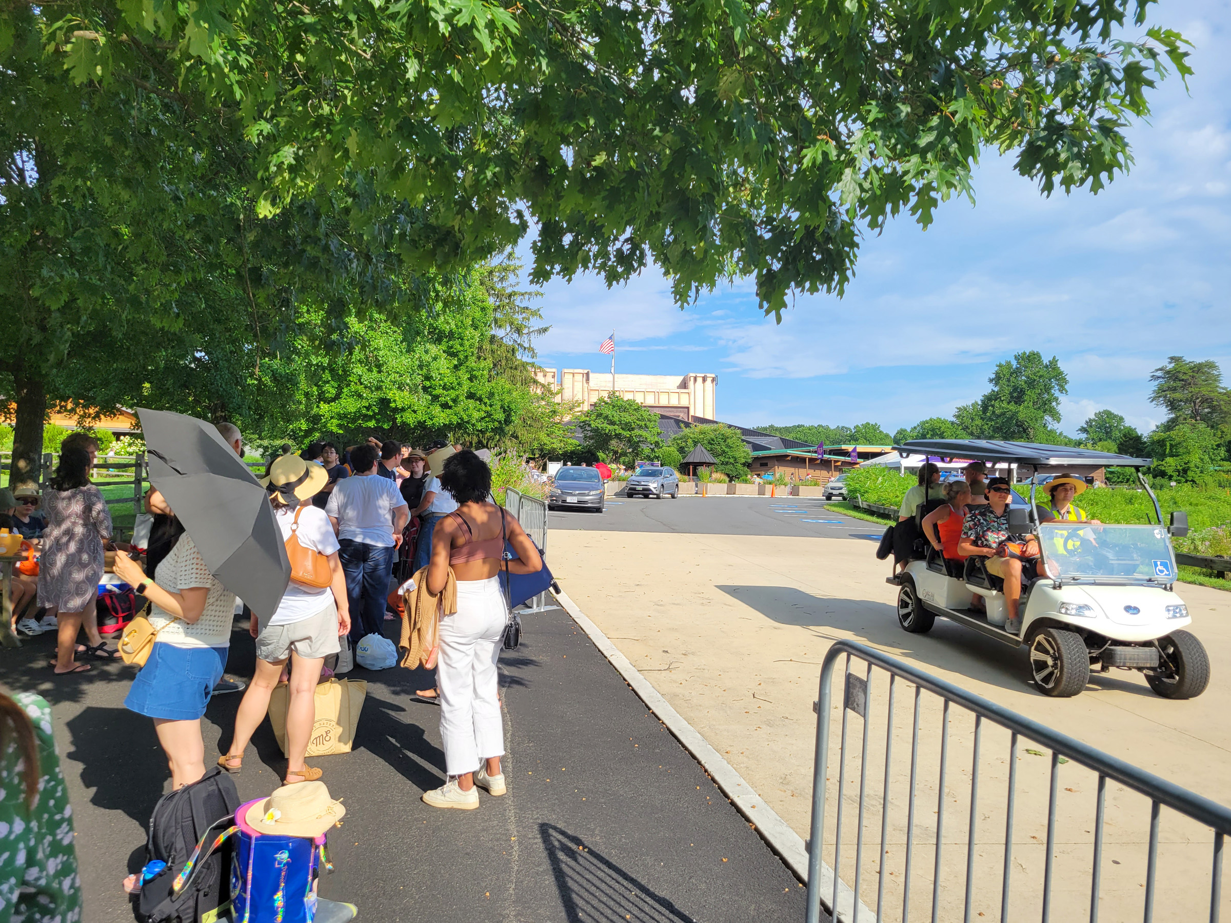 무더운 7월의 토요일 오후, 피크닉 음식을 바리바리 싸온 사람들이 공연시작 2시간 전부터 입장을 위해 줄을 서있고, 국립공원청 직원이 카트로 손님을 우리 뒤쪽 멀리 대기줄의 끝으로 태워주고 있다. 가운데 멀리 보이는 필렌센터(Filene Center)의 입구와 야외극장의 모습은, 여기를 클릭해서 이 날 입장권을 사기 위해 두 달 전에 매표소에 들렀을 때 찍은 사진들을 보시면 된다.
