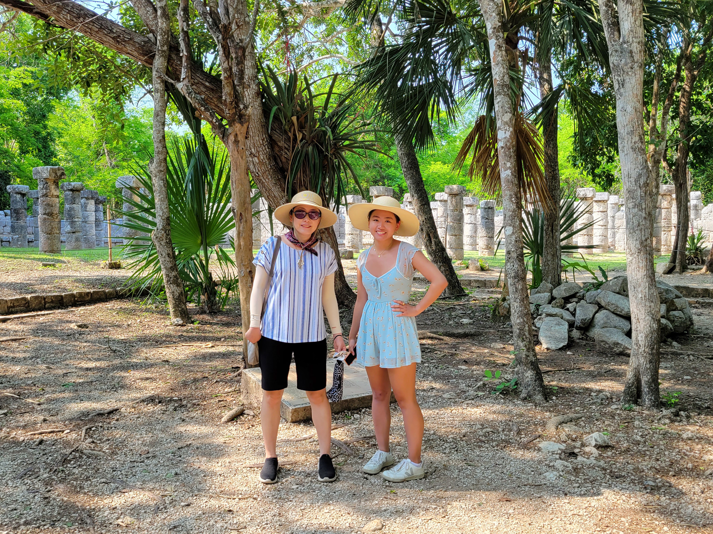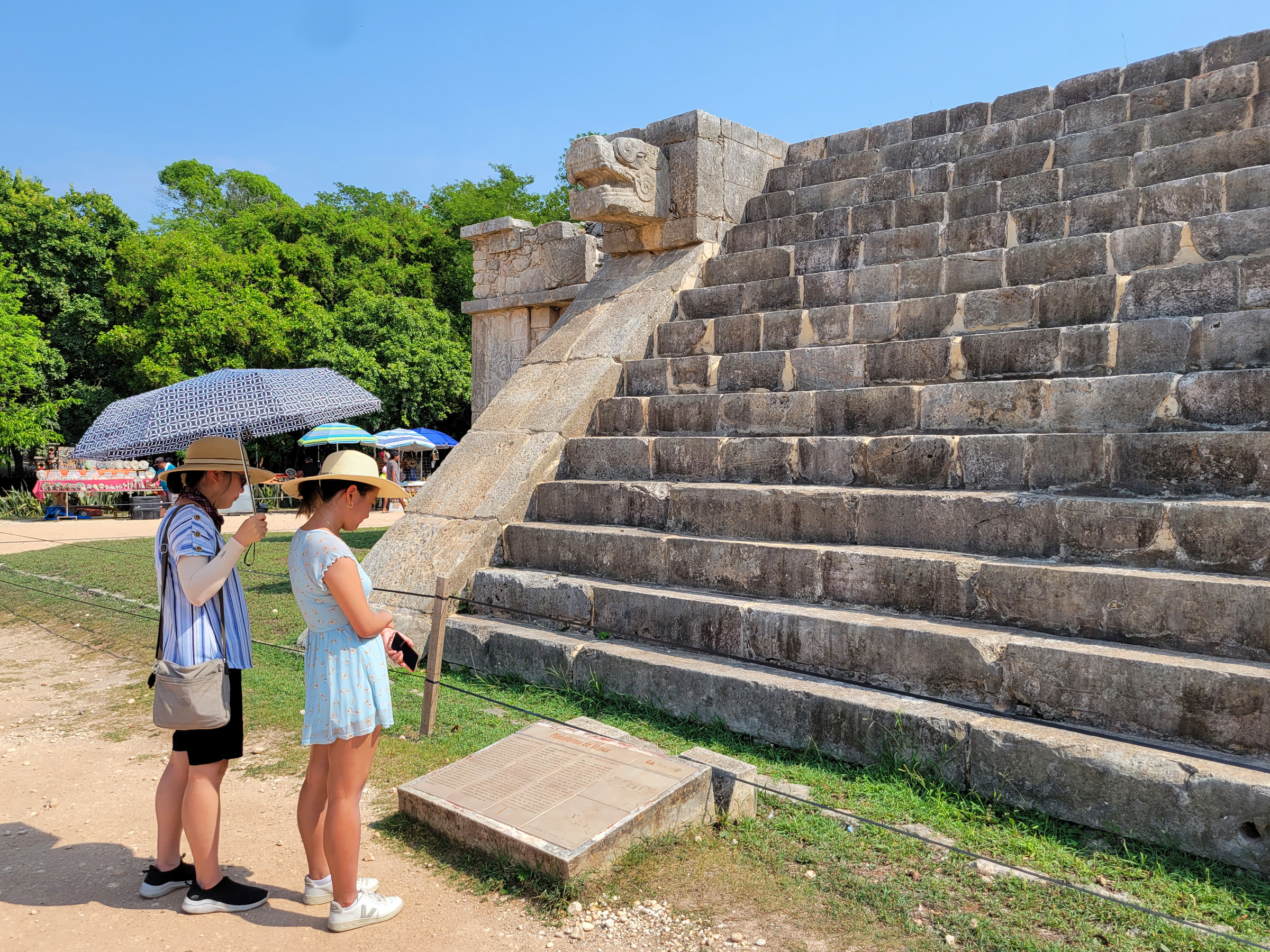 피라미드의 북쪽에 있는 작은 제단인 '비너스의 플랫폼(Platform of Venus)' 설명판을 읽고 있는 모녀의 모습인데, 여기서 제법 더 북쪽 숲속으로 걸어가야 나오는 '성스러운 우물(Cenote Sagrado)' 구경은 생략하기로 했다.