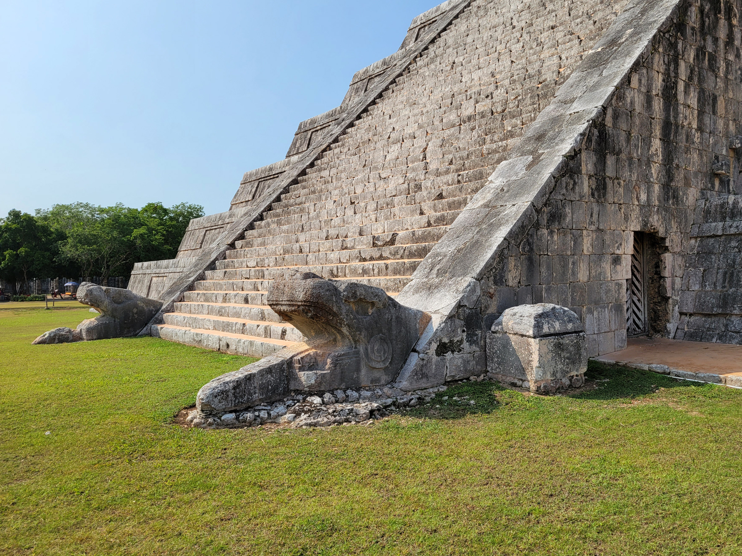 계단 좌우에 입을 벌리고 있는 뱀 대가리가 마야인들이 섬겼던 깃털 달린 뱀신인 쿠쿨칸(Kukulcan)이고, 춘분과 추분에 뱀의 그림자가 어쩌고저쩌고 하던데 복습은 생략... 그런데, 계단의 옆쪽에 내부로 들어가는 문이 있다는 사실을 처음 알았다.