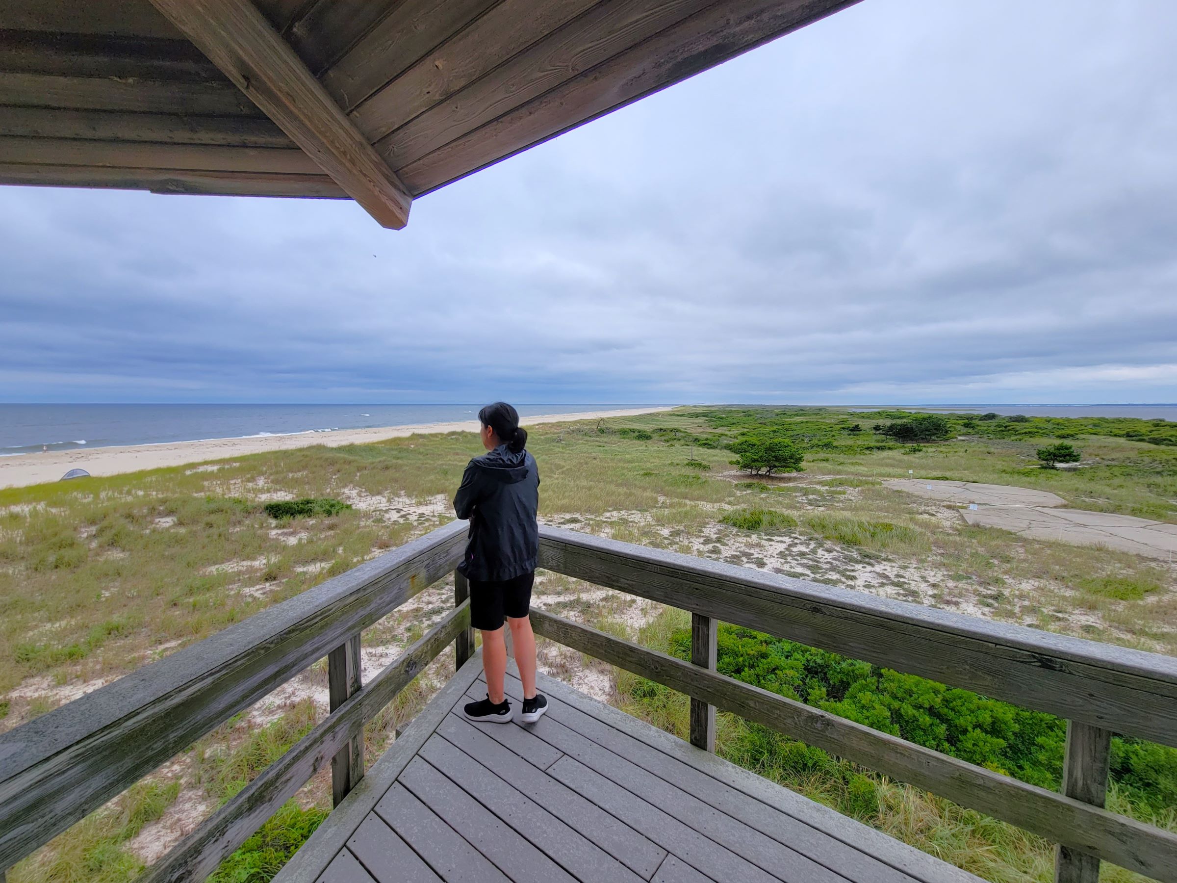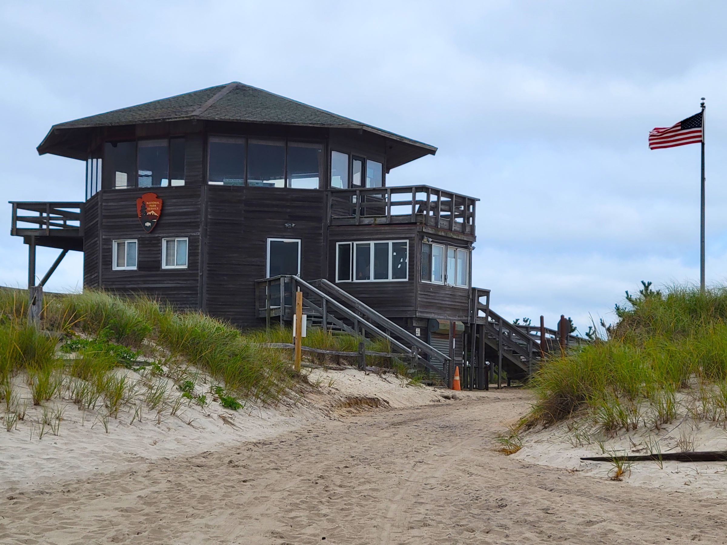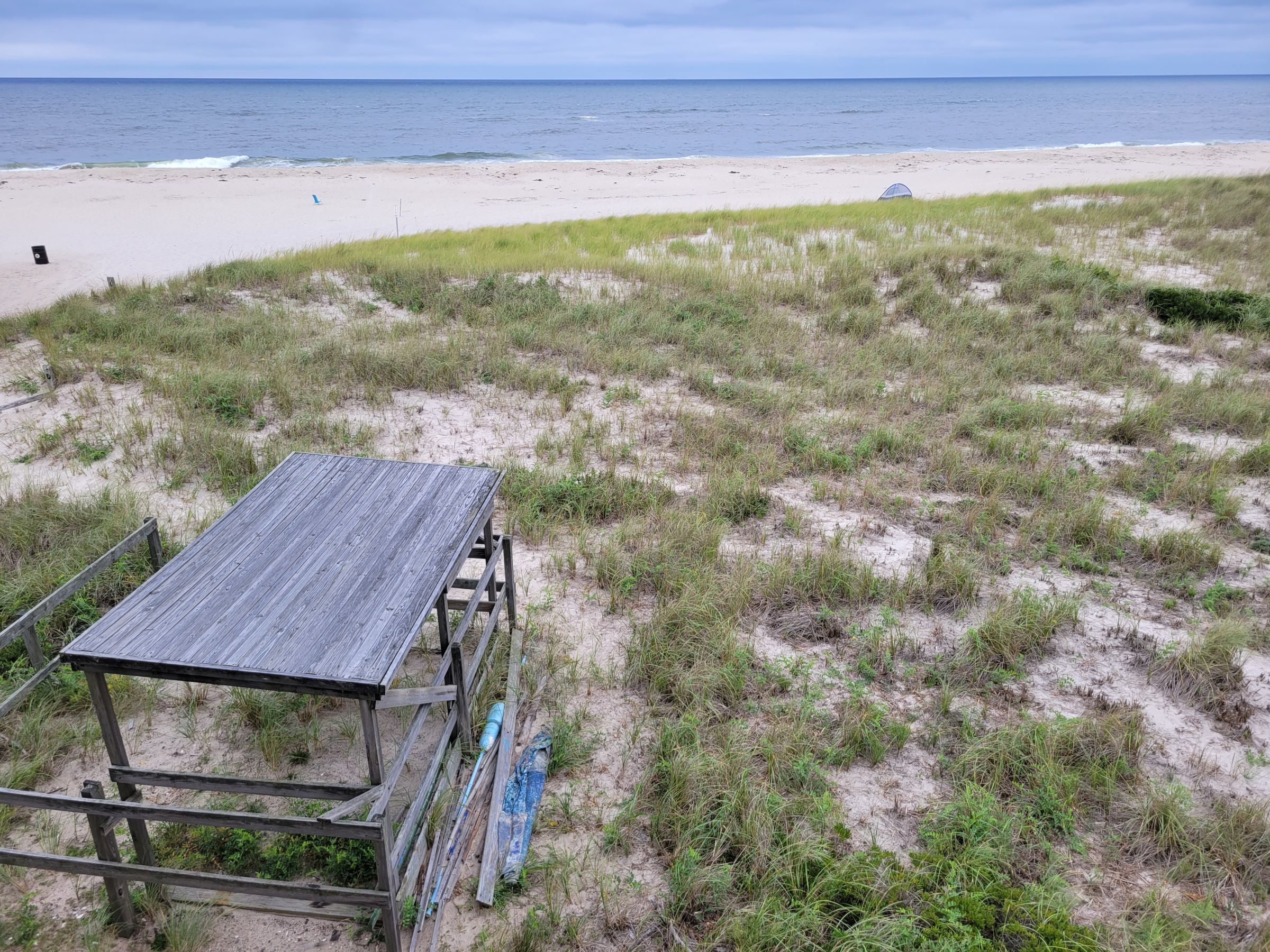 뉴욕주의 다른 NPS 공원 브로셔들까지 한 번에 챙겨 밖으로 나와서 남쪽 대서양 바닷가를 바라보니... 백사장에는 왼쪽부터 쓰레기통, 비치 의자, 작은 텐트(바람막이?) 하나씩만 차례로 보이는 휑한 풍경이었다~^^