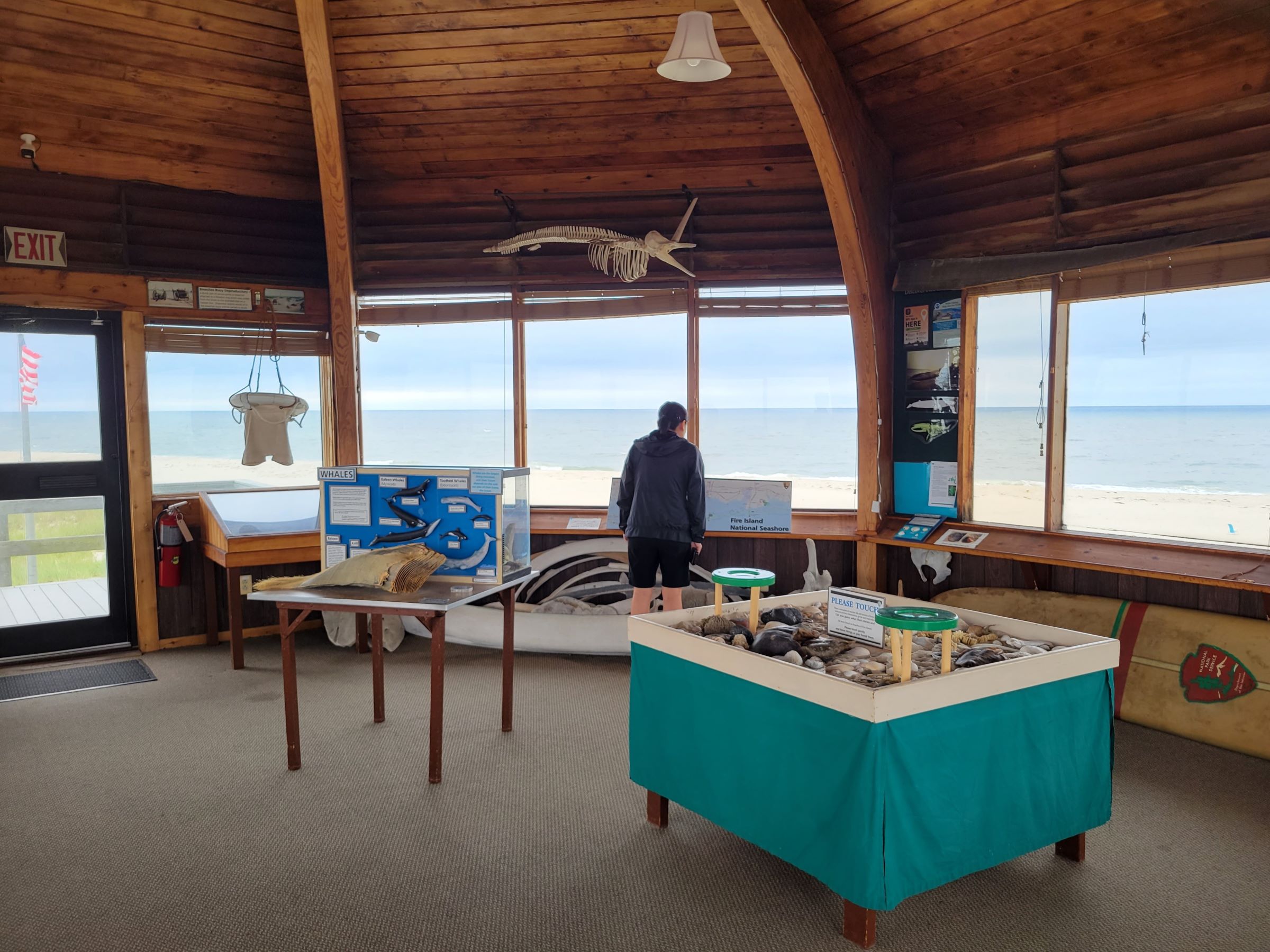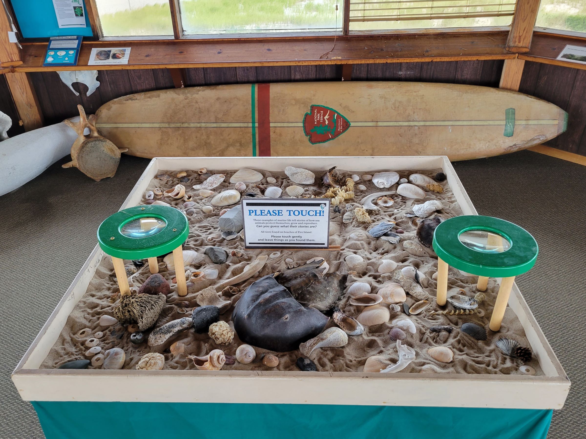 국립공원청 로고가 그려진 오래된 서핑보드가 눈에 띄었고, 앞쪽 테이블에는 조개껍질 등 다양한 해양 생물의 잔해를 만져볼 수 있도록 해놓았는데, 가운데 까맣고 커다란 것은 혹시 진짜 삼엽충인가?!