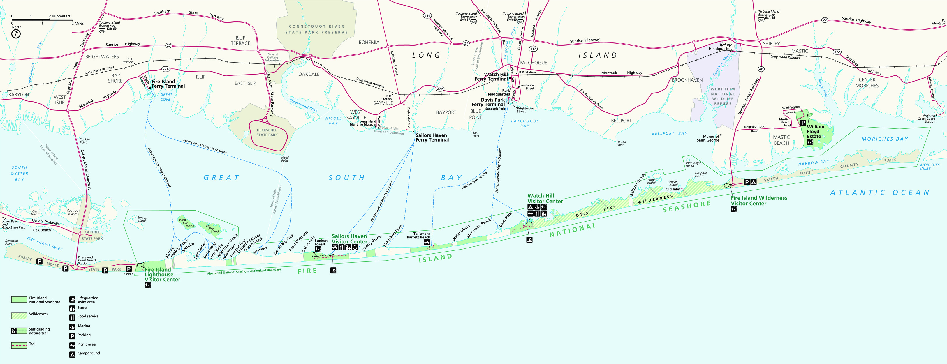 롱아일랜드의 남쪽 바다에도 좁고 기다란 평행사도(barrier island)가 발달해 있는데, 동서로 봤을 때 거의 가운데 위치한 파이어 섬(Fire Island)에서 지도에 표시된 길이 약 26마일(42 km) 영역이 국립 해안으로 1964년에 지정되었다. 포장도로는 본섬에서 양쪽 끝의 입구까지만 만들어져 있어서, 가운데에 위치한 두 곳의 비지터센터는 배를 타야만 가볼 수 있는 것도 특이하다.