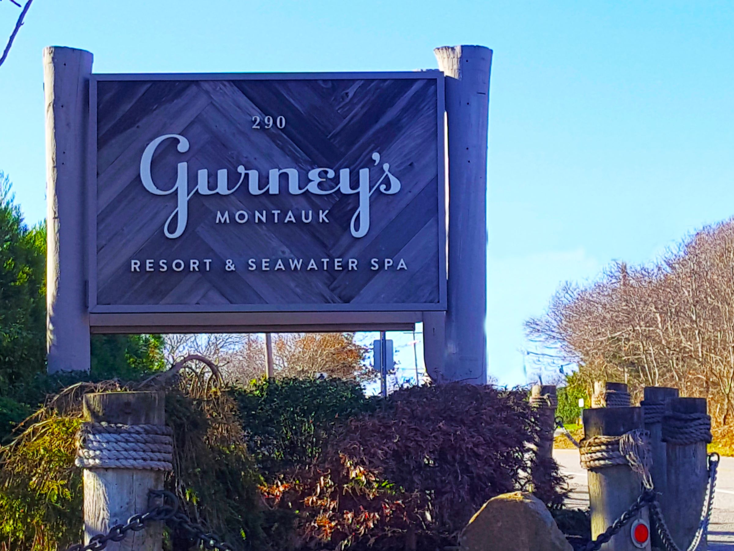 그 리조트의 이름은 거니스(Gurney's)인데 발렛파킹만 가능하고 레스토랑 가격도 상당히 쎈 것 같아서, 그냥 자동차로 돌아서 바로 나왔기 때문에 간판 사진은 위키에서 가져왔다. 호텔명이 '거니'라서 요즘 한국의 누구 별명이 떠올랐지만, 영단어 gurney는 '바퀴달린 들것'을 의미하며 사람의 성씨로 사용된다고 한다. 그리고 간판의 가운데에 씌여있는 가장 동쪽 끝의 마을 이름인 몬탁(Montauk)은 옛날 영화에 중요한 장소로 나왔었다.