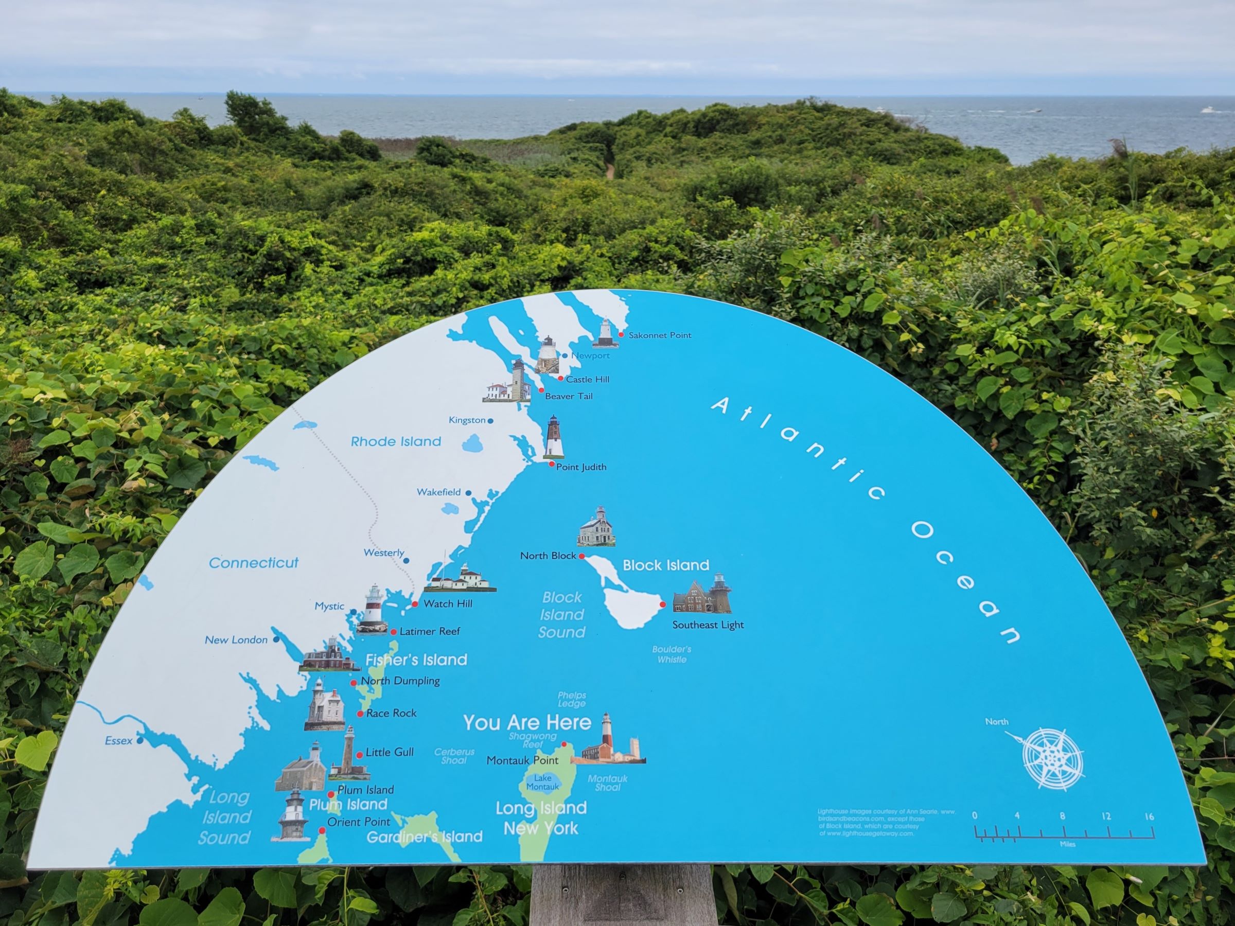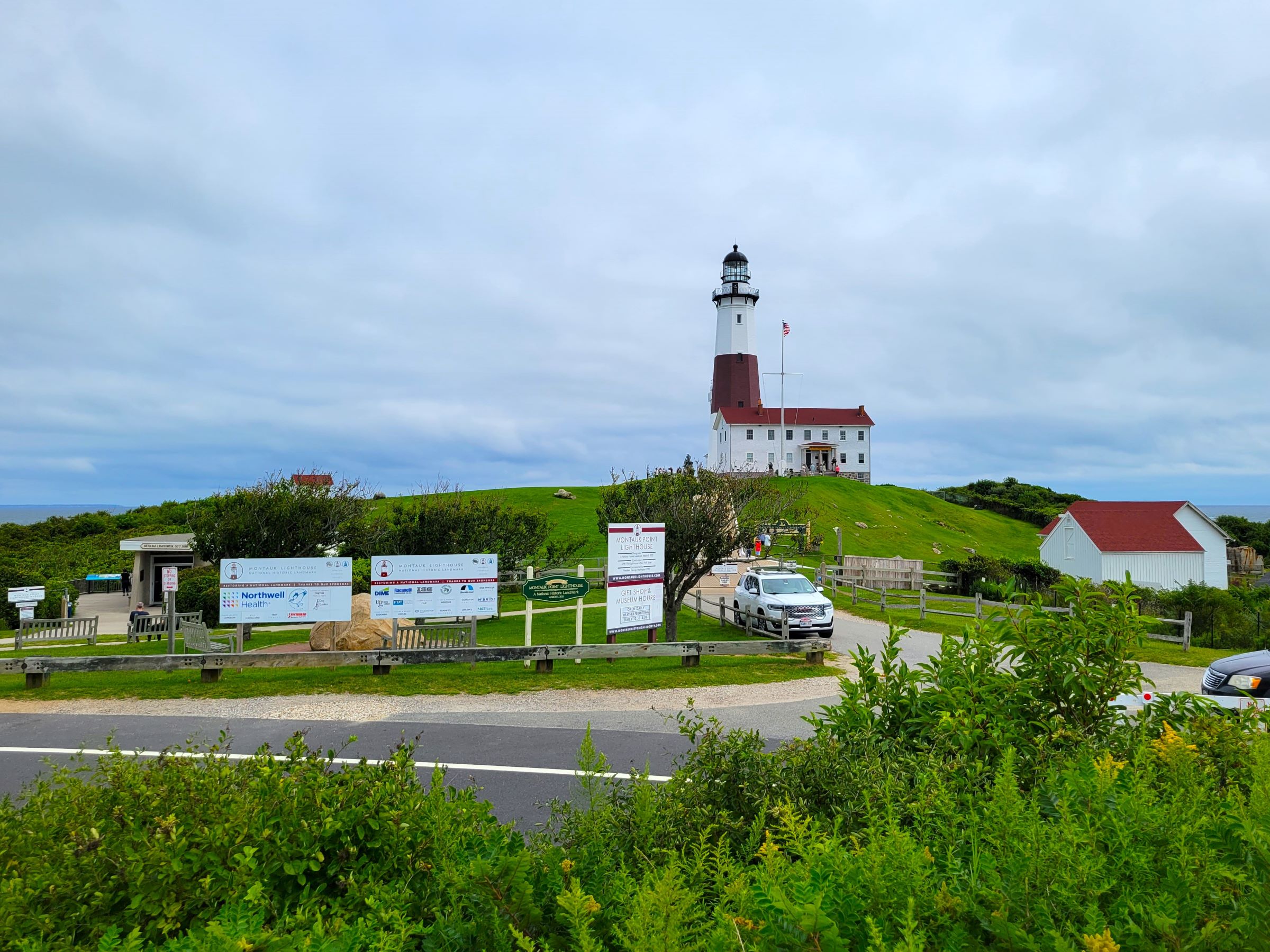 우리는 그래서 입장은 하지 않고, 그냥 기념품 가게와 화장실만 이용하고는 전망대쪽으로 나와봤다. 롱아일랜드의 동쪽 끝까지 왔더니 거리상으로 코네티컷 주를 거의 다 가로지른 것이 되어서, 사진의 정면 북동쪽 앞바다 너머로는 로드아일랜드(Rhode Island) 주이다.