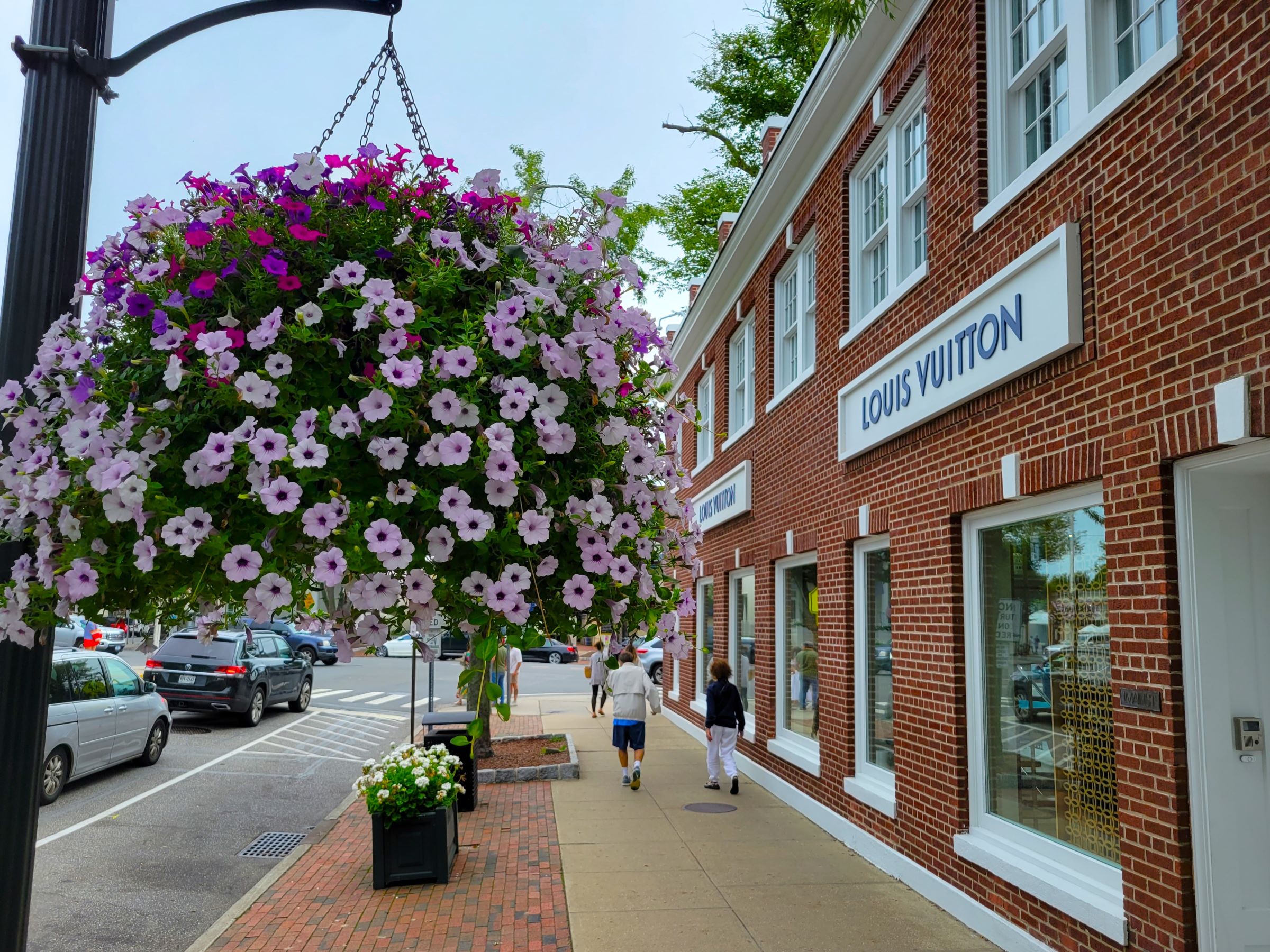 잘 가꿔진 꽃들이 매달린 가로등 옆의 빨간 벽돌 건물은 루이비통 매장이었고,