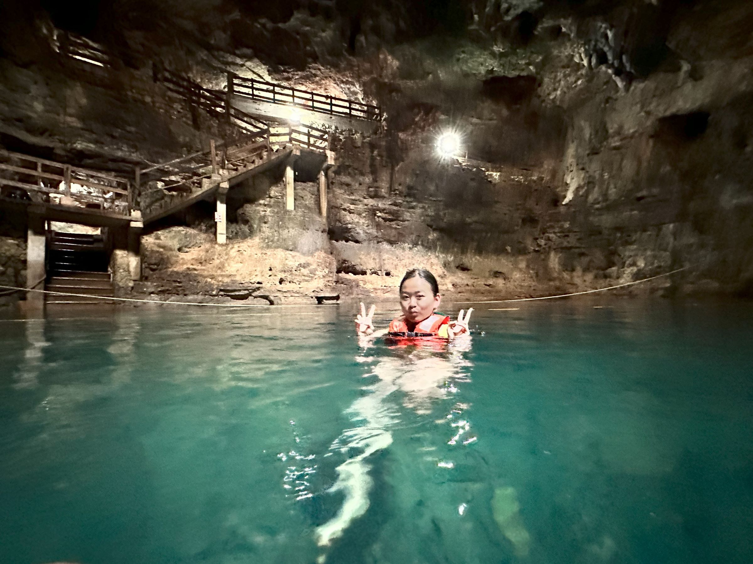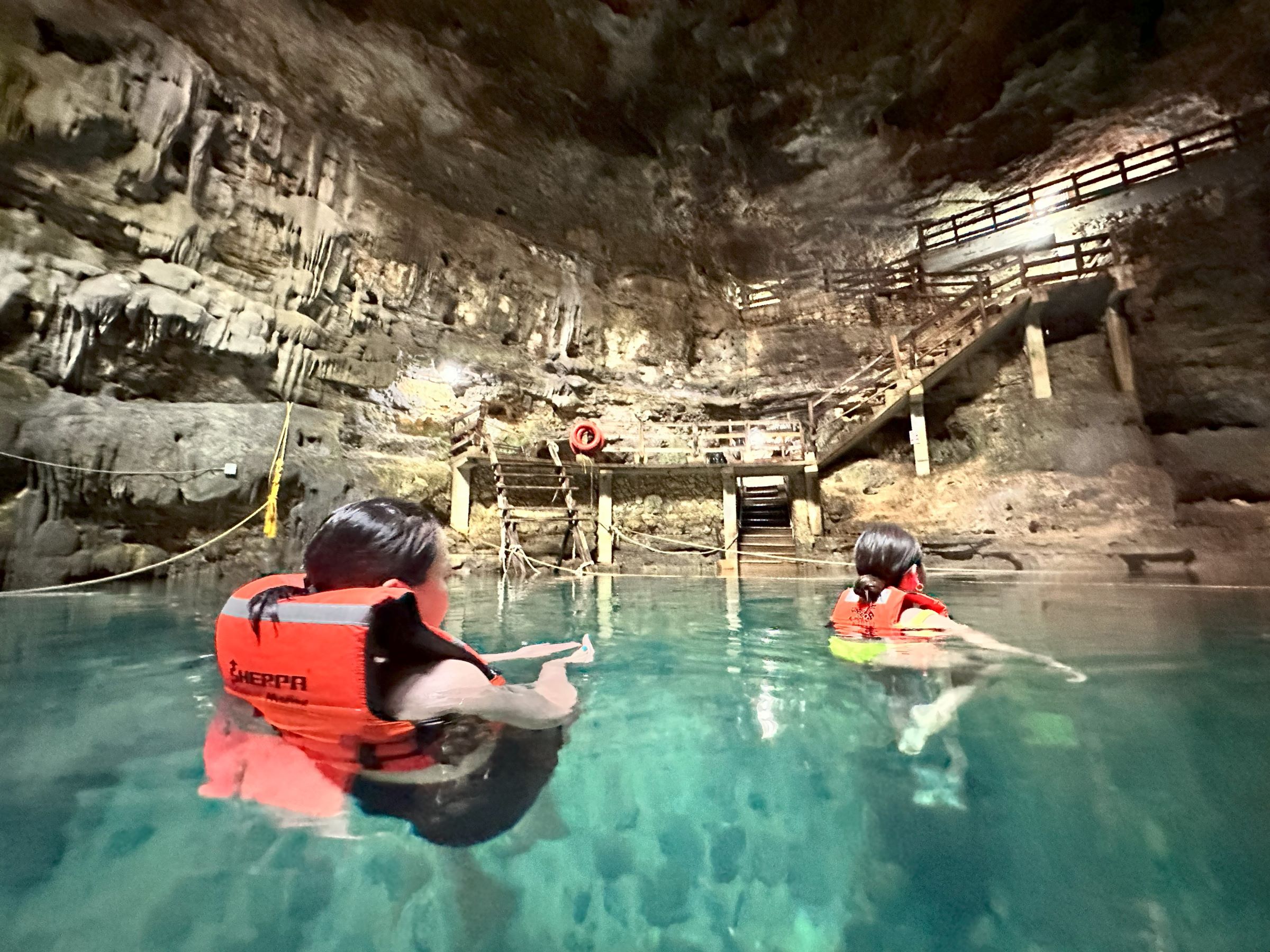 가운데 위기주부가 먼저 입수하고, 지혜가 뒤따르다가 사진 찍는 엄마를 보고 V자를 하고 있다. 직전과 거의 비슷한 형태의 세노테였는데, 일단 여기는 사람들이 많아서 시끄러울 정도였고, 나중에 보여드리는 멋진 볼거리가 하나 더 있다.