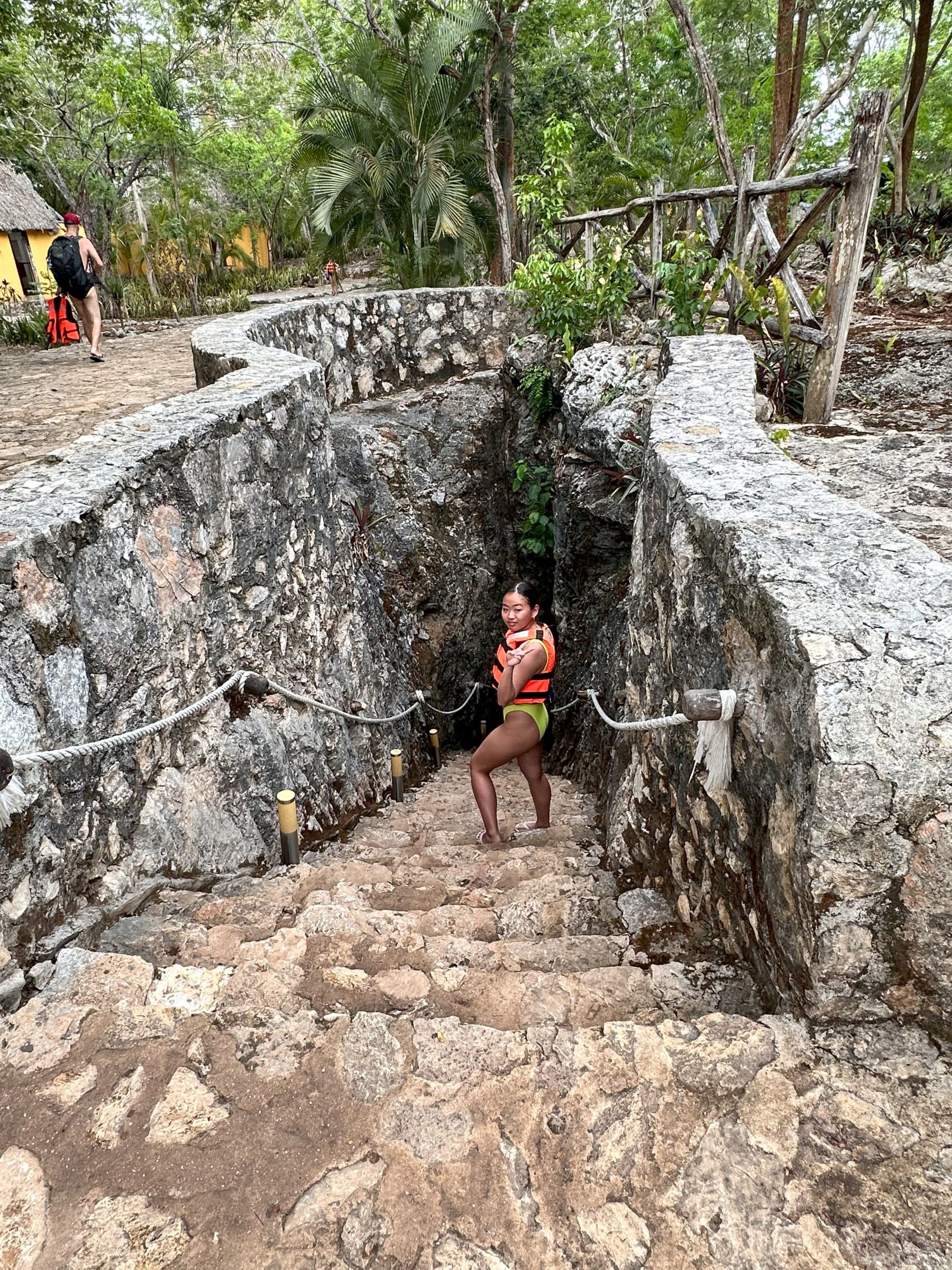 내려온 통로와 계단이 뒤로 보이는데, 나무판에 물기가 있어서 미끄러웠으므로 조심해야 한다. 우리가 들어온 후에 앞서 있던 사람들이 나가고, 이 세노테는 우리 가족 3명의 독차지가 되었다.