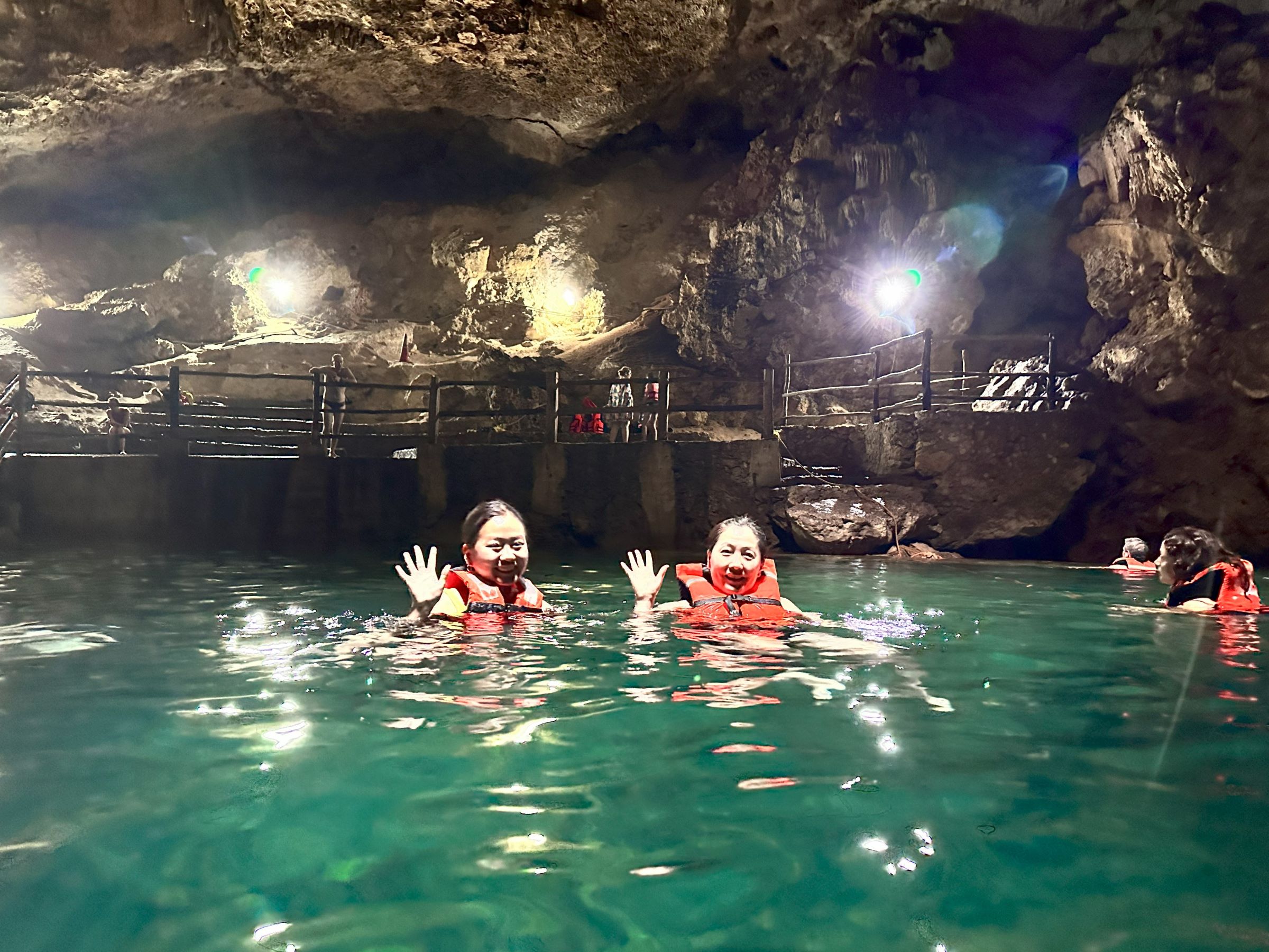 가운데 위기주부가 먼저 입수하고, 지혜가 뒤따르다가 사진 찍는 엄마를 보고 V자를 하고 있다. 직전과 거의 비슷한 형태의 세노테였는데, 일단 여기는 사람들이 많아서 시끄러울 정도였고, 나중에 보여드리는 멋진 볼거리가 하나 더 있다.