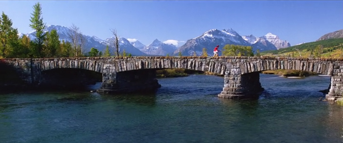 호수를 건너는 다리 위를 달리고 있는 빨간 운동복의 포레스트 검프(Forrest Gump)를 동영상에서 보실 수 있습니다!