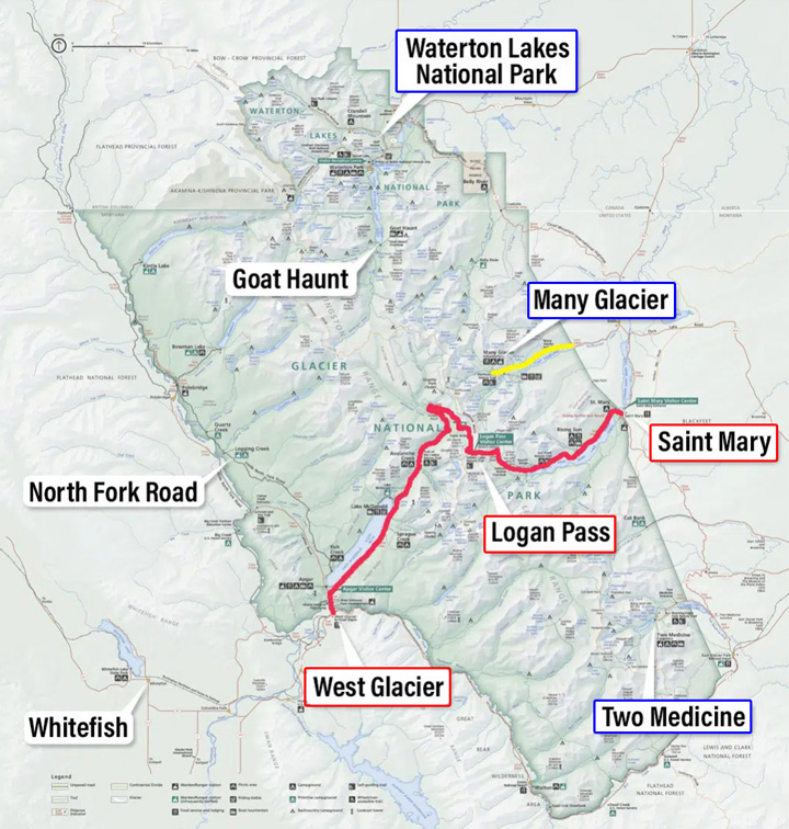 Earth Trekkers 사이트에서 가져온 구역이 표시된 지도로, 빨간색 고잉투더선 로드(Going-to-the-Sun Road)와 주변 지역은 직접 방문한 경험을 바탕으로, 파란색의 이외 지역은 인터넷 내용을 참고해서 영상을 제작했습니다.