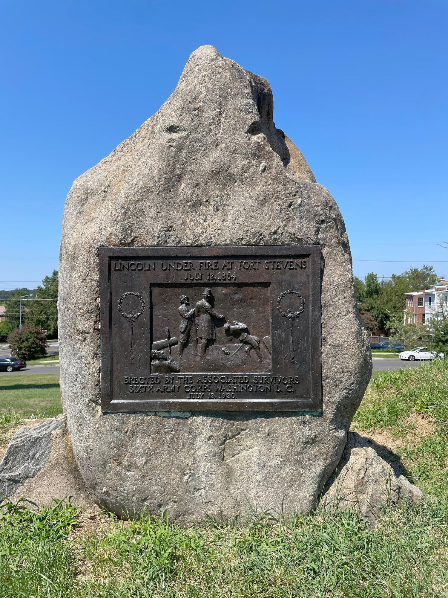 그 상황을 직접 목격했던 퇴역 군인들이 1920년에 만든 기념물이 당시 링컨이 서있던 자리에 지금까지 세워져 있다는데, 동판의 그림은 더 리얼하게 바로 옆의 사람이 총에 맞아 쓰러지는 모습을 묘사하고 있다. 흔히 '포트 스티븐스 사건'으로 불리는 이 순간은 미국의 현직 대통령이 전쟁터에서 적군의 사격에 노출되었던 그야말로 전무후무한 경우라고 한다.