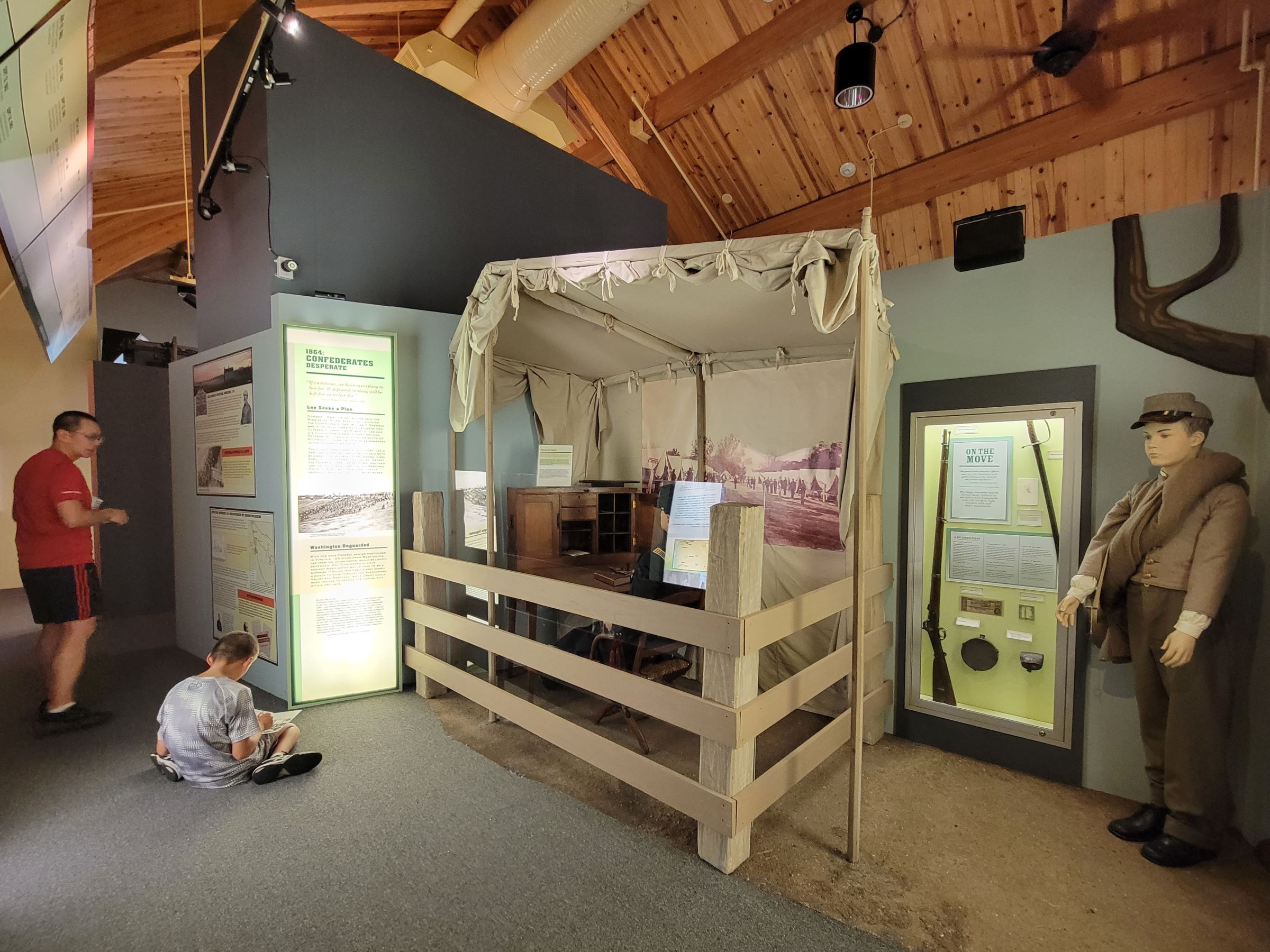 이 전투 직전까지의 남북전쟁 상황 등을 설명하는 전시물 앞에서, 아이 한 명이 바닥에 앉아 쥬니어레인저 과제를 열심히 하고 있는 모습이다.