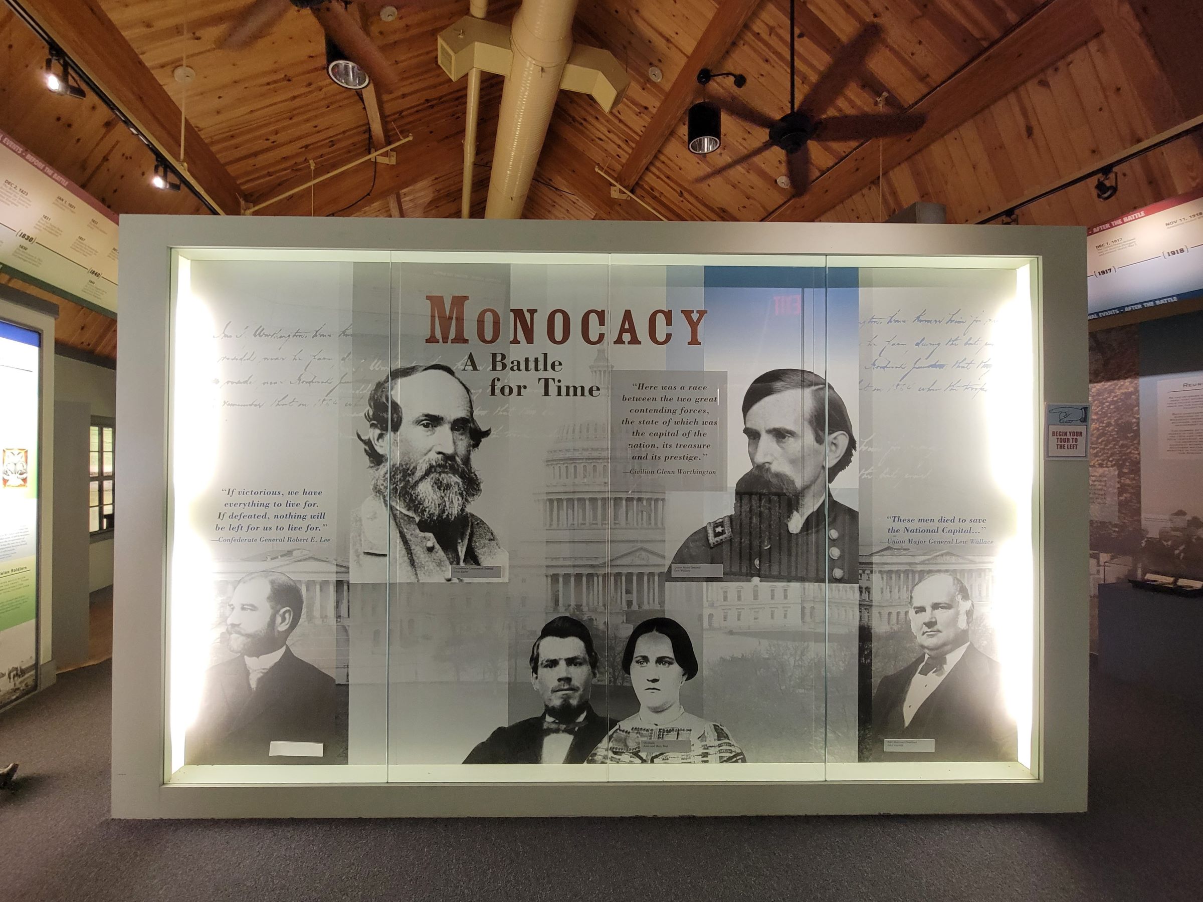 입구에 <Monocacy: A Battle for Time>이라 적혀 있는 의미는 차차 아시게 되고... 모노카시 강은 포토맥 강의 지류로 원주민들이 "river with many bends"라는 뜻의 Monnockkesey로 부른 것에서 유래한 이름이란다. 윗줄 오른편의 까만 턱수염이 북군 지휘관 월러스(Wallace)로, 그는 전쟁이 끝나고 뉴멕시코 준주의 지사로 재임하면서 역사소설을 하나 출간하는데, 영화로도 만들어져 누구나 알고 있는 그 책의 제목은 바로 <벤허> Ben-Hur: A Tale of the Christ 이다.