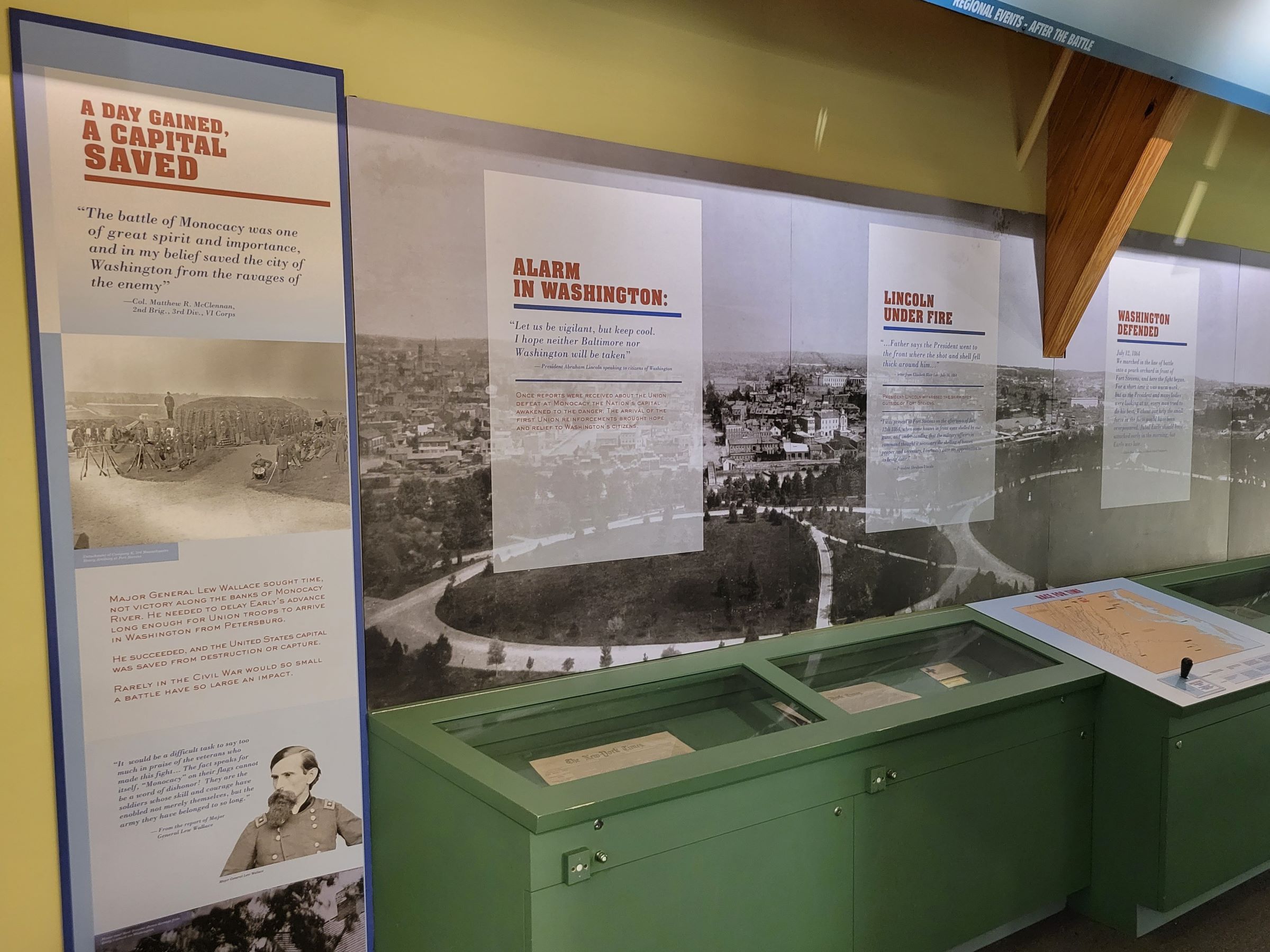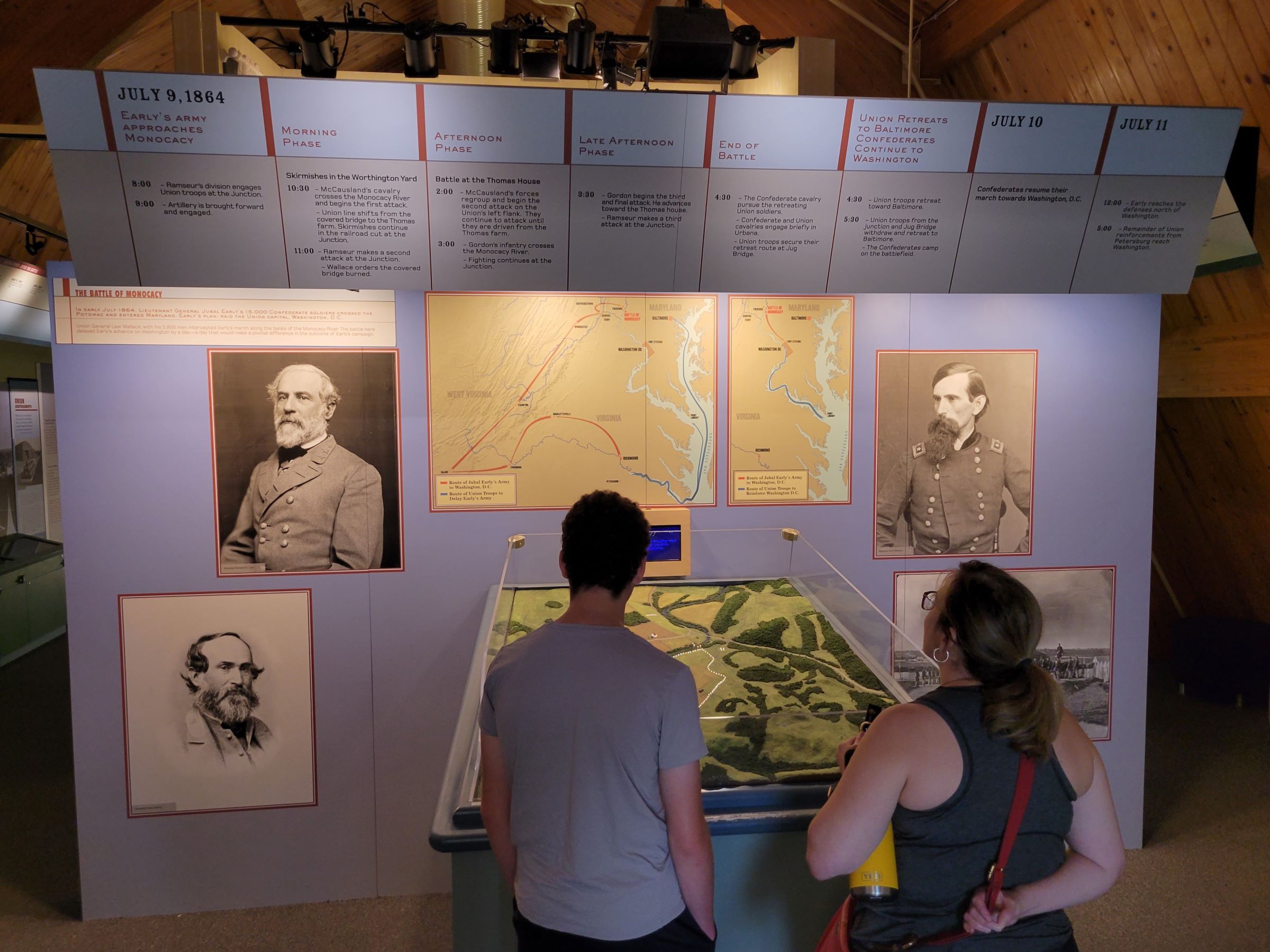 안내판 오른쪽의 마름모 모양 지도에 회색으로 표시된 경로로 우회한 얼리(Early)의 남군 15,000명이 7월 9일에 이 곳에서 루 월러스(Lew Wallace) 소장이 이끄는 북군 6,600명과 전투를 벌였다. 월러스는 대부분 전투 경험이 없는 신병 3,200명을 데리고 볼티모어에 주둔하고 있다가, 북군 총사령관 그랜트가 급히 보낸 3,400명과 함께 허겁지겁 도착해서 두 배가 훨씬 넘는 적군과 싸우게된 것이었다.