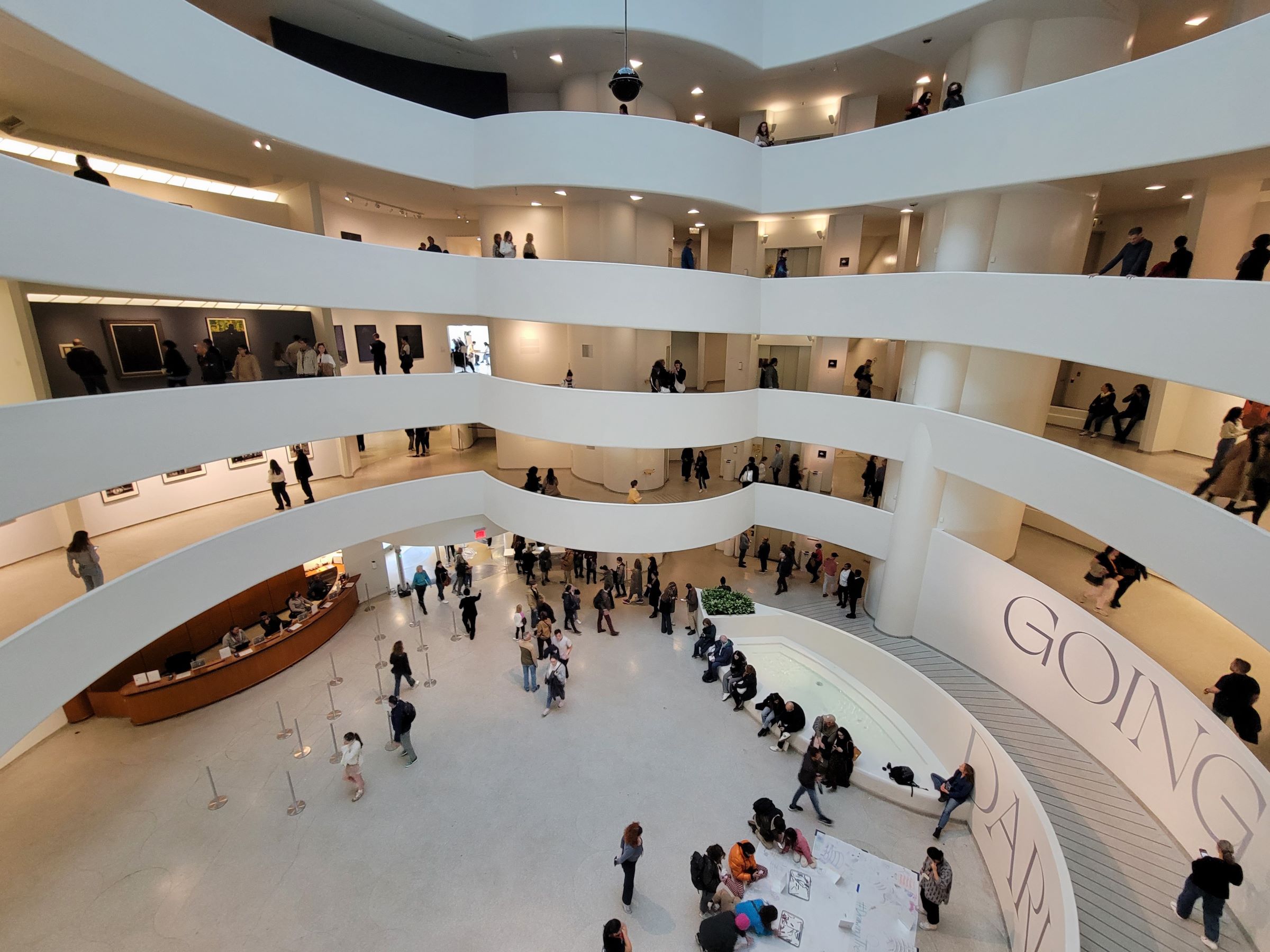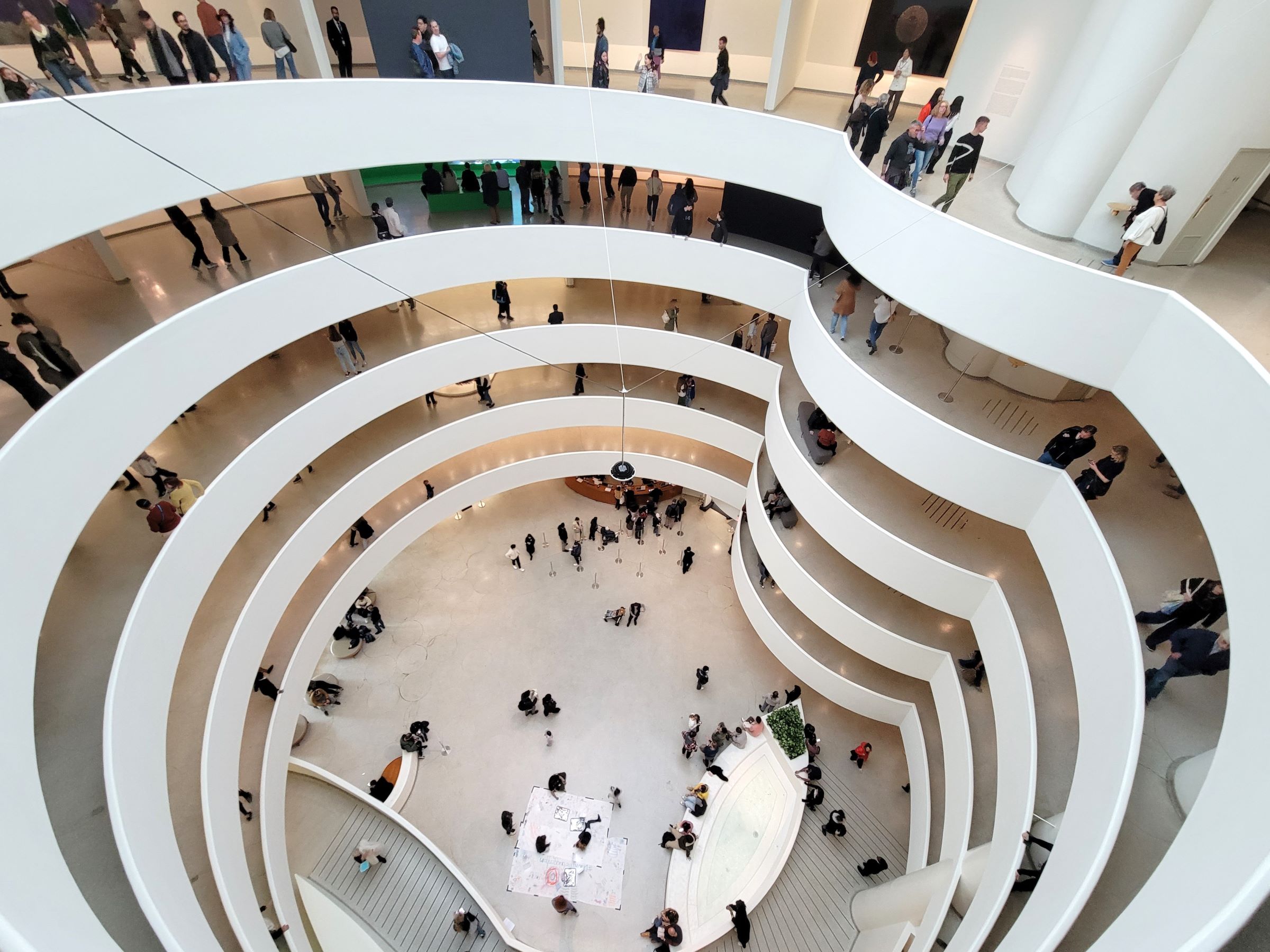 6층이라고 부르는 제일 높은 곳까지 올라와서, 핸드폰을 조심스럽게 꽉 쥐고 밑으로 찍은 사진인데, 실제 높이는 일반 건물의 10층 정도는 되는 느낌이었다. 원형으로 튀어나온 발코니의 중심에 엘리베이터와 계단 등이 있고 바닥이 평평한 보조 전시장과 연결이 되며, 나선의 내부 지름은 거의 동일하게 올라오지만, 경사로의 폭이 위로 올라올 수록 밖으로 점점 넓어지기 때문에 외부에서 봤을 때는 건물의 위쪽 지름이 더 큰 모양이 되었다.