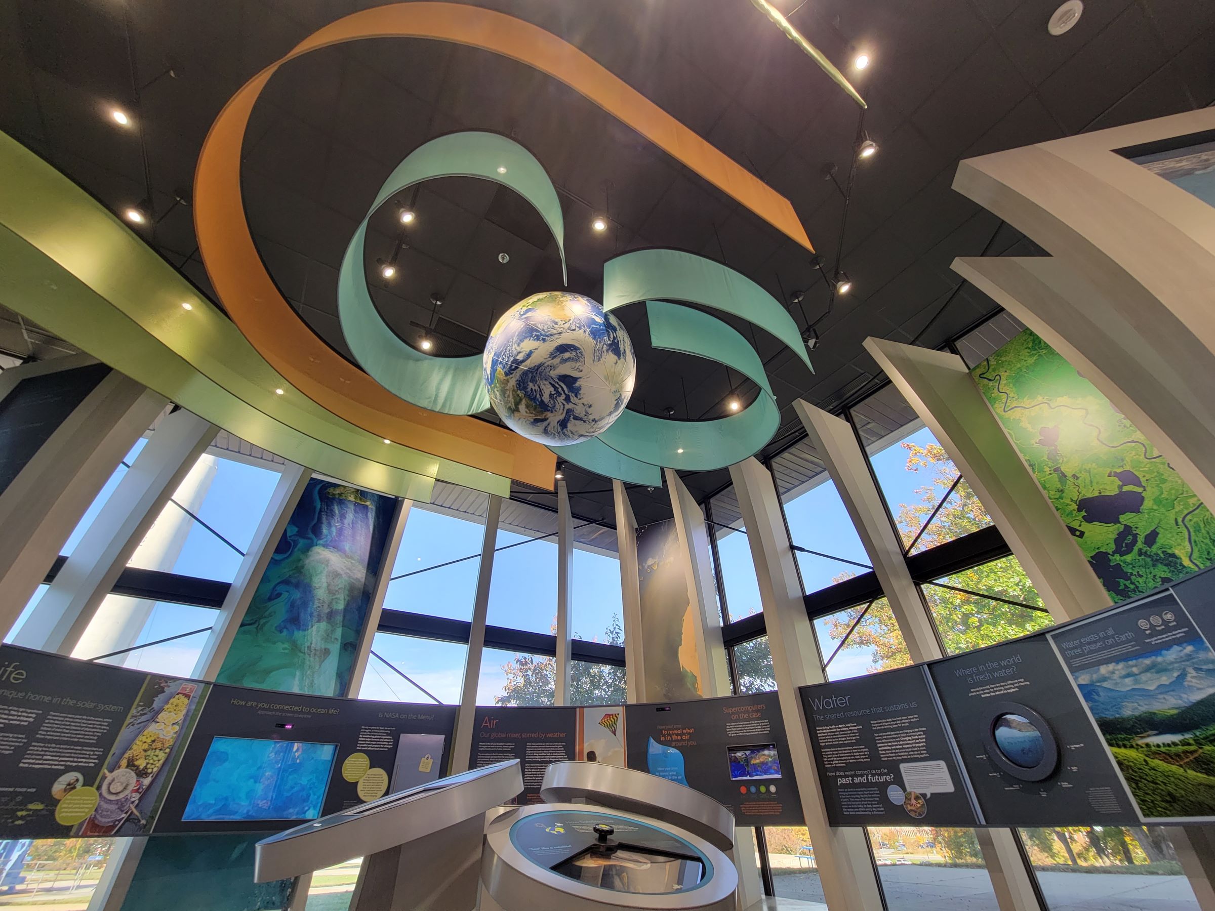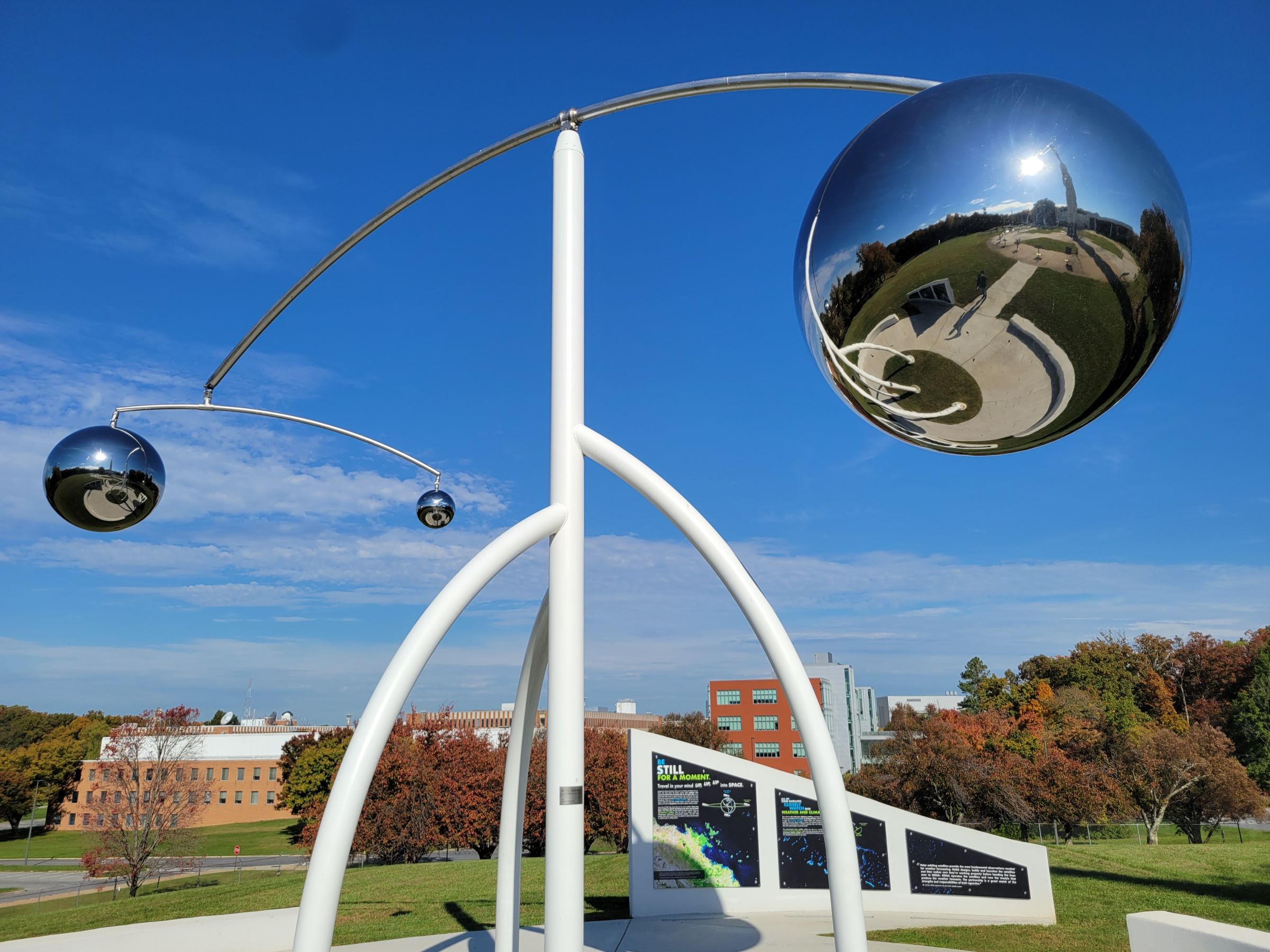 Orbits Interweave라는 모빌같은 설치미술 작품도 하나 있지만, 쇠공이 너무 무거워 보여서 잘 움직이지는 않을 것 같았다.^^ 그 뒤쪽으로 고다드 우주비행센터의 실제 연구소 건물들이 보이는데, 약 40개의 건물에 과학자 2천명을 포함해 약 1만명이 근무하고 있단다.