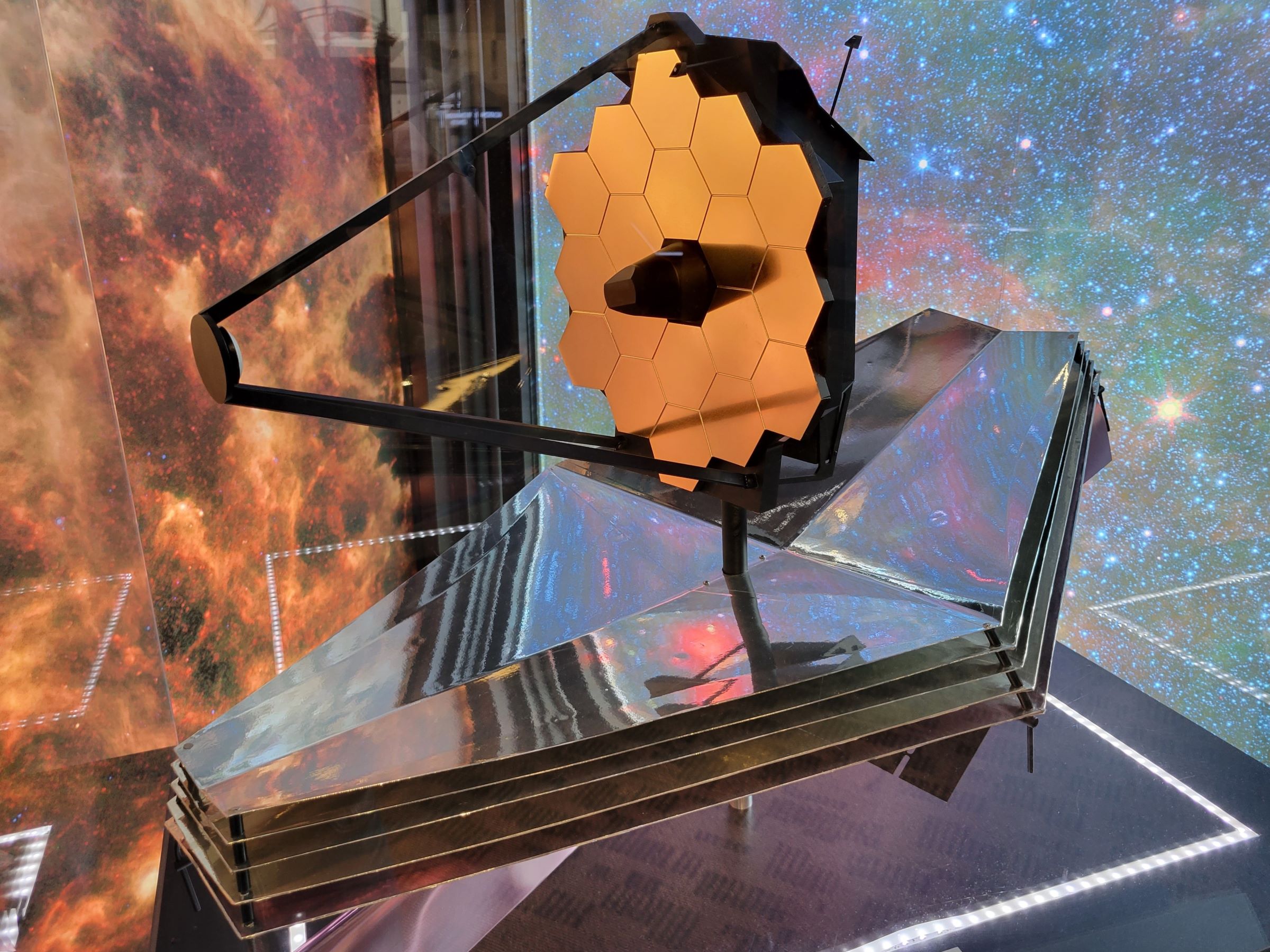지름 1.3m의 육각 반사경 샘플을 가져다 놓았는데, 실제와 같은 금색 코팅에 약간 오목했다. 이 거울 18개를 뒤의 그림과 같이 배열해서 주경의 지름이 6.5m와 맞먹는 반사망원경을 만든 것이다. 거울보다 더 까다로운 부분이 아래쪽 5겹의 차폐막인데... 설명이 너무 길어지니까, 혹시 관심이 있으신 분은 넷플릭스 <언노운> Unknown 시리즈 '우주를 보는 타임머신' 편을 보시기 바란다. 344개의 단일장애점(single point of failure)!