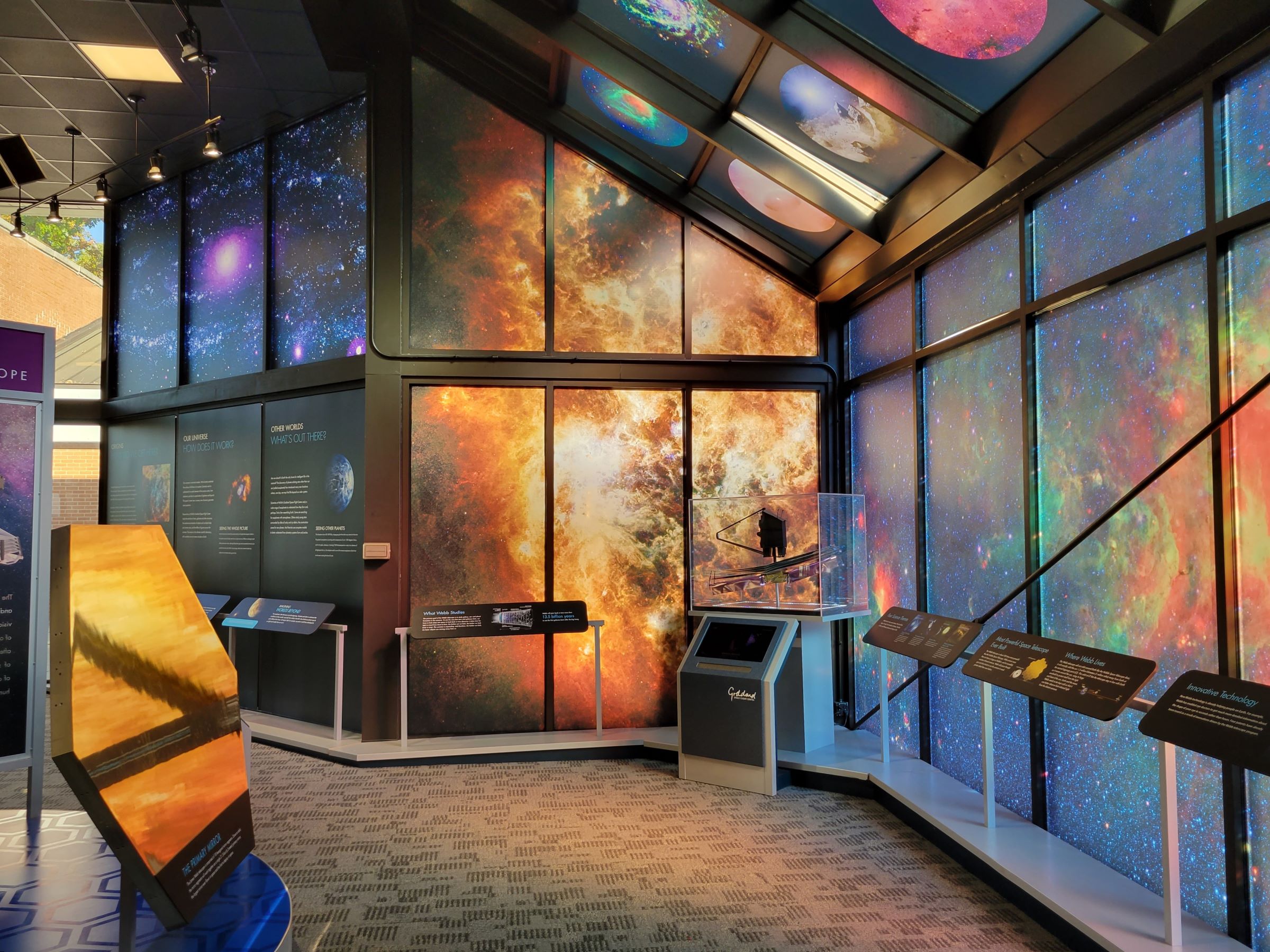 1990년에 발사되어서 현재까지도 지구 상공 약 560km에서 작동 중에 있는 허블 우주망원경(Hubble Space Telescope)의 모형이 그 옆에 매달려 있는데, 전임자인 허블도 여기 고다드 우주비행센터에서 최종 완성이 된 후에 케네디 우주센터로 운반되었다.