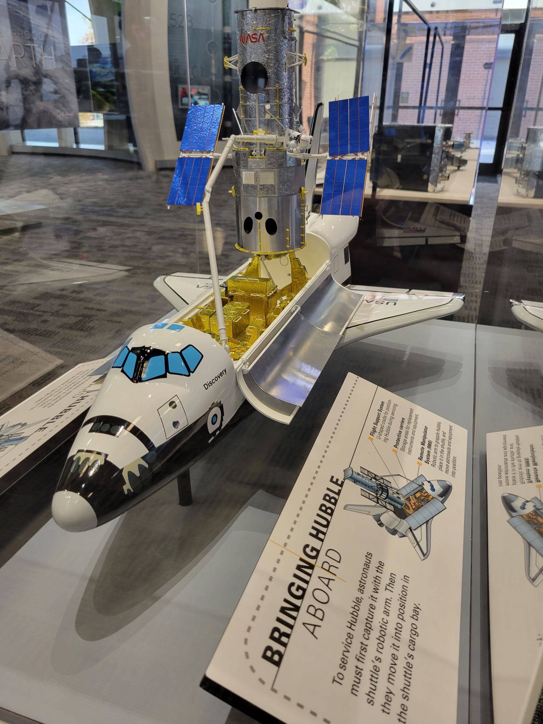 허블 망원경은 모형과 같이 우주왕복선과 도킹해서 지금까지 총 5번의 수리를 받았는데, 마지막 2009년 5월에 아틀란티스(Atlantis) 호의 STS-125 미션은 IMAX 영화로도 제작되었다. 유일하게 두 번이나 허블 수리에 투입되었던 우주왕복선 디스커버리(Discovery) 호의 실물은 여기를 클릭해서 보실 수 있다.