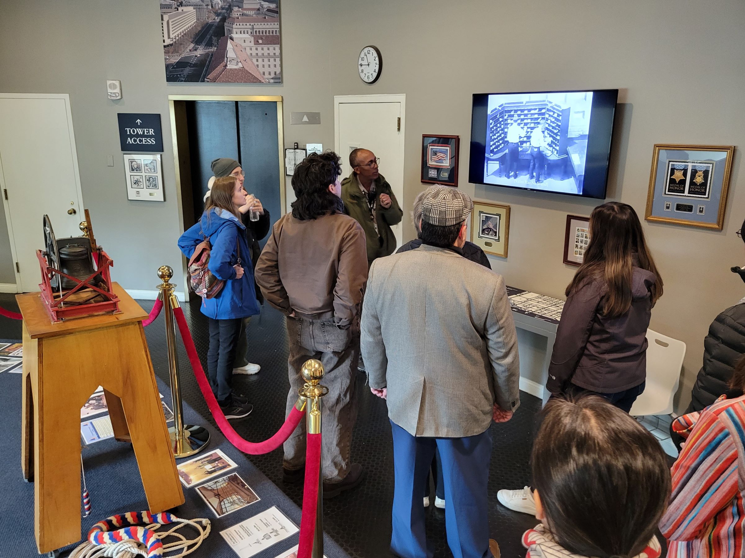 9층에서 시계탑 꼭대기는 다시 저 작은 엘리베이터를 타야 하는데, 전망대의 인원수를 25명으로 제한해서 타고 내려온 사람 수 만큼만 태워서 올려보내는 식으로 운영되고 있었다. (방문에 예약은 필요 없음) 기다리는 동안에 가운데 직원이 여러 이야기를 해주거나 질문에 답하는데, 왼편 바닥에 놓여진 여러 사진과 설명 중에서 제일 아래 있는 그림을 확대해 보여드린다.