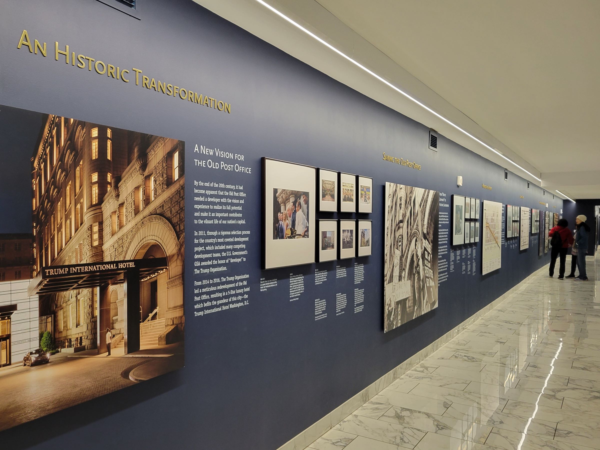 전시의 마지막에 '반가운' 이름과 그의 가족사진까지 등장을 한다.^^ 앞서 수리 후 30년 가까이 지나 건물이 다시 노후화되자, 정부는 민간사업자와 60년 임대계약을 하는데 그 상대가 바로 트럼프 회사였다! 그리하여 우체국 건물은 2억5천만불의 리모델링을 거쳐 객실 270개의 최고급 호텔로 거듭나게 되고, 트럼프 인터내셔널 호텔(Trump International Hotel)이 그가 힐러리를 꺽고 대통령에 당선되기 불과 2주전인 2016년 10월말에 정식 개장을 했다. 일단 여기서 국립공원청 직원의 안내에 따라 엘리베이터를 타고 9층으로 올라가서 계속...